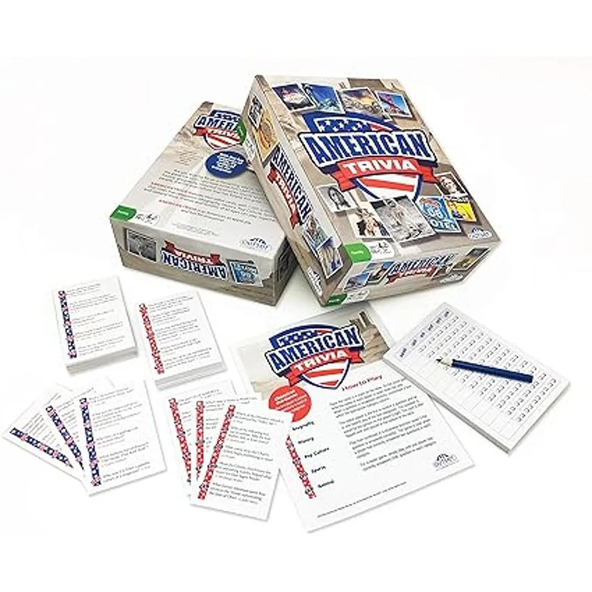 Divertido juego de fiesta: American Trivia cuenta con tarjetas de dos caras, con 1.000 preguntas que cubren cinco categorías: geografía, historia, cultura pop, deportes y trivia general. Hace de este un gran juego de fiesta que puede ser jugado por una amplia gama de edades.