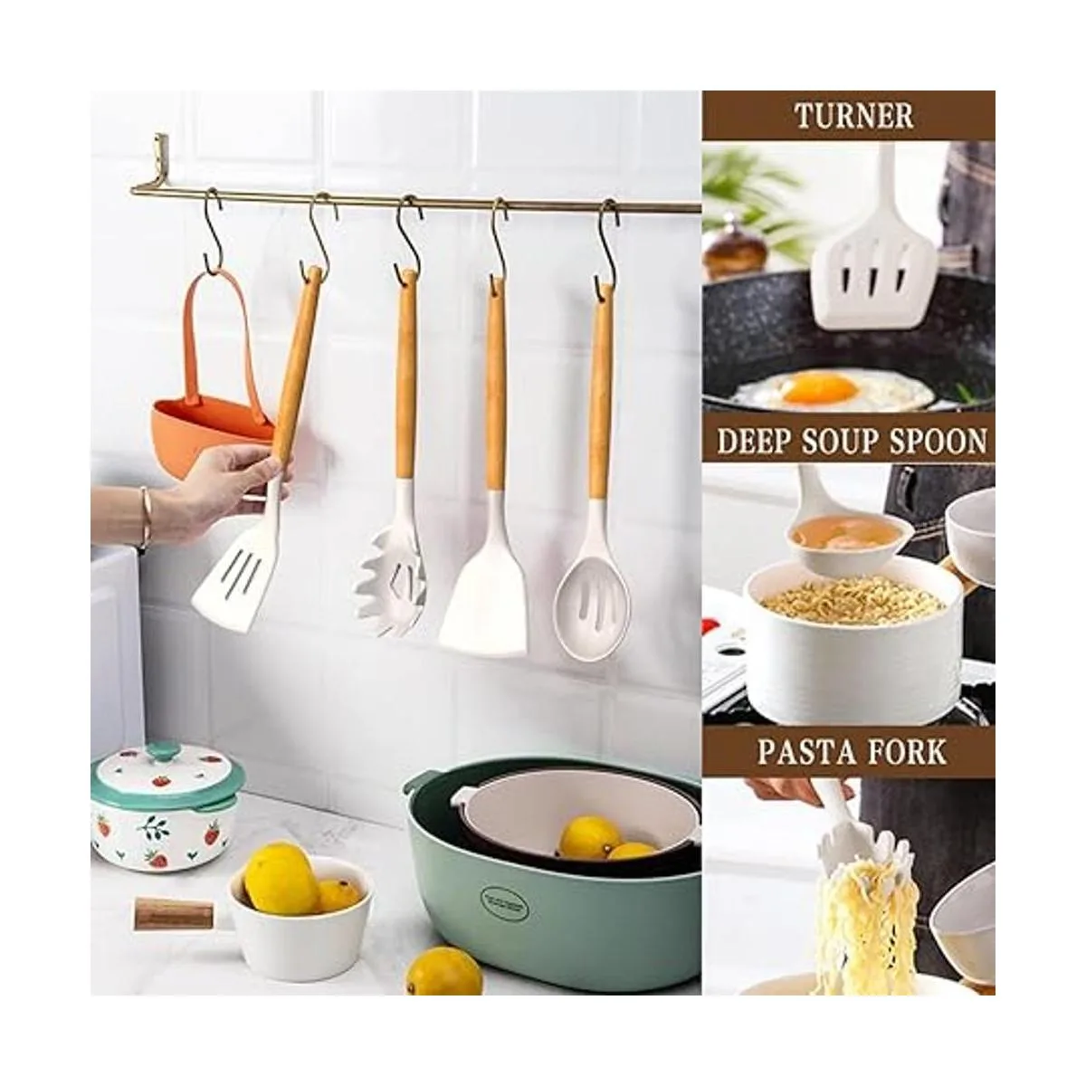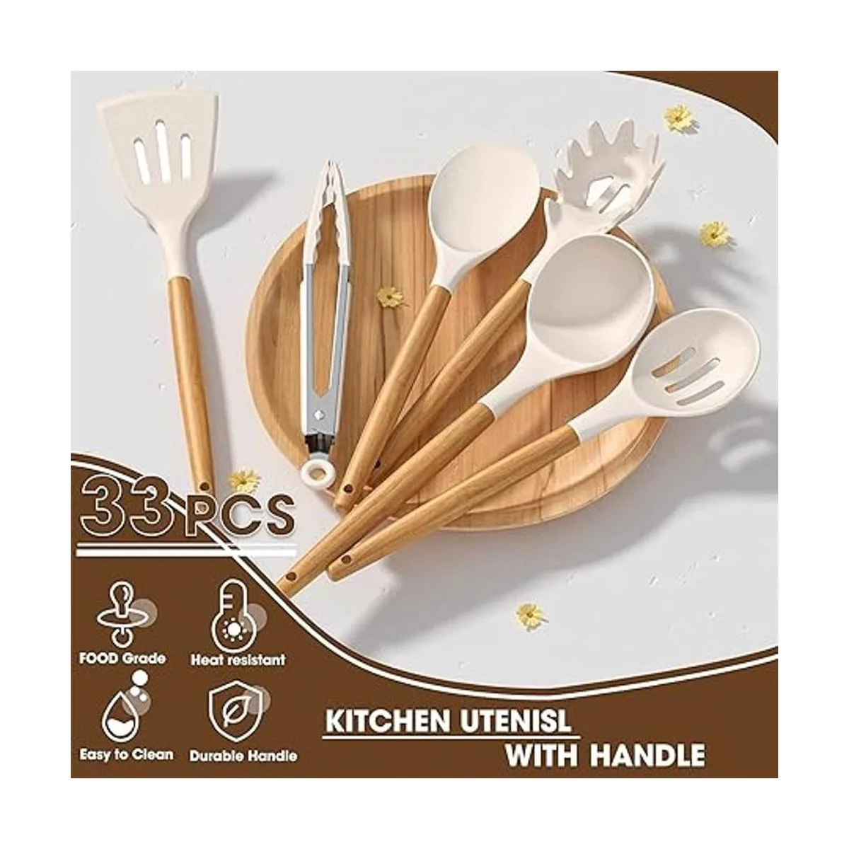 Juego de 33 utensilios de cocina de madera duradera: antiquemaduras que protegen tu mano de quemaduras, el juego de 33 utensilios de cocina de silicona profesional incluye espátula flexible, cucharón de sopa, cucharas de servir servidor de pasta, espátula giratoria, pinzas, taza de mesurado y cucharas, 10 ganchos, alfombrilla de silicona, etc. Satisface todo tipo de necesidades de cocina