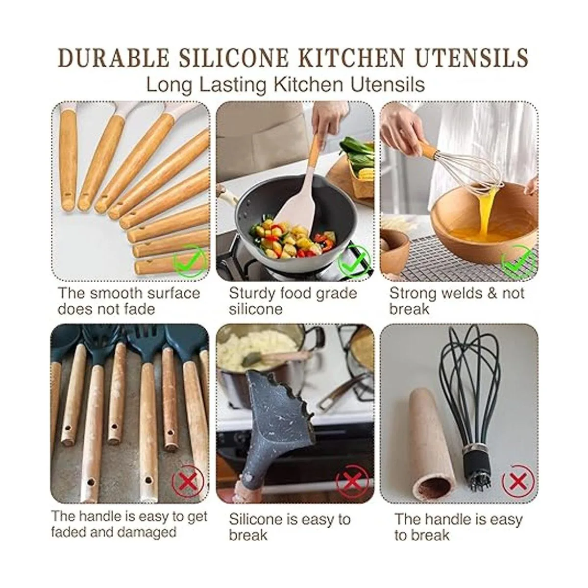 Silicona de grado alimenticio: hecha de silicona de grado alimenticio, sin BPA, se puede utilizar en cualquier tipo de alimentos. Y probablemente durará más que los otros utensilios de cocina de plástico. Estos utensilios de cocina de silicona no reaccionan con alimentos o bebidas, no tienes que preocuparte por que la salud de tus familias no retenga olores o colores cuando lo utilices para remover productos alimenticios a base de tomate