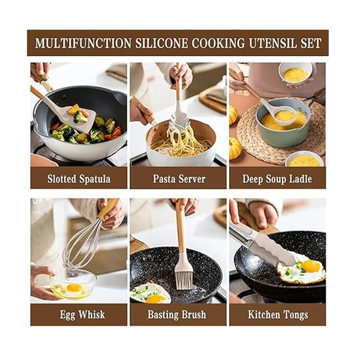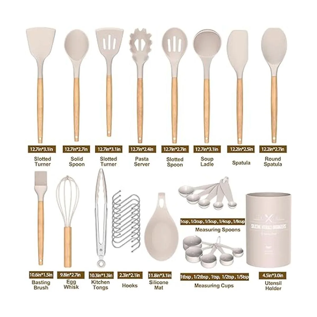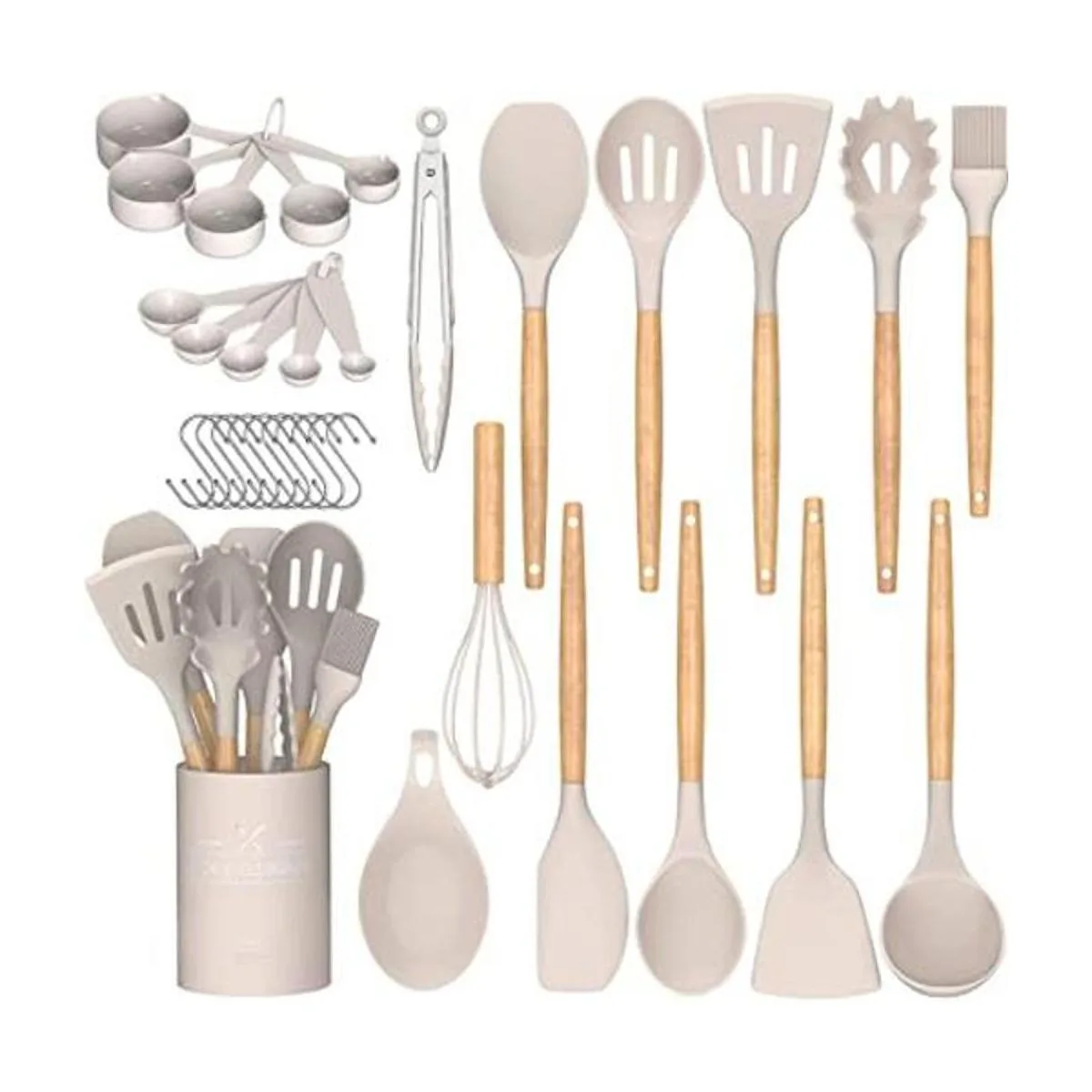 Juego de utensilios de cocina Umite de cocina, 24 piezas antiadherentes de silicona utensilios de cocina juego de espátula con soporte, mango de madera de silicona resistente al calor utensilios de cocina Set Khaki