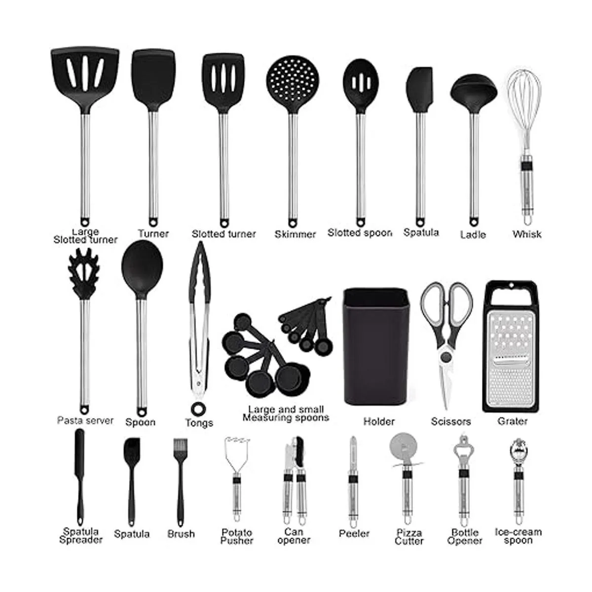 33 utensilios de cocina: el juego de utensilios incluye todo lo que necesitas para cocinar ese plato perfecto, incluye espátula ranurada, cuchara ranurada, espátula flexible, espátula ranurada, espátula ranurada, espátula sólida, servidor de pasta, cuchara sólida, pinzas de cocina, cuchara de drenaje, batidor, cucharón de sopa profundo, espátulas, cepillo, pelador, cortador de pizza, abrebotellas, patatas, empujador, Ier. Cuchara de crema Abrelatas, rallador, tijeras, tazas medidoras y cucharas, cepillo pequeño, espátula pequeña, espátula, soporte