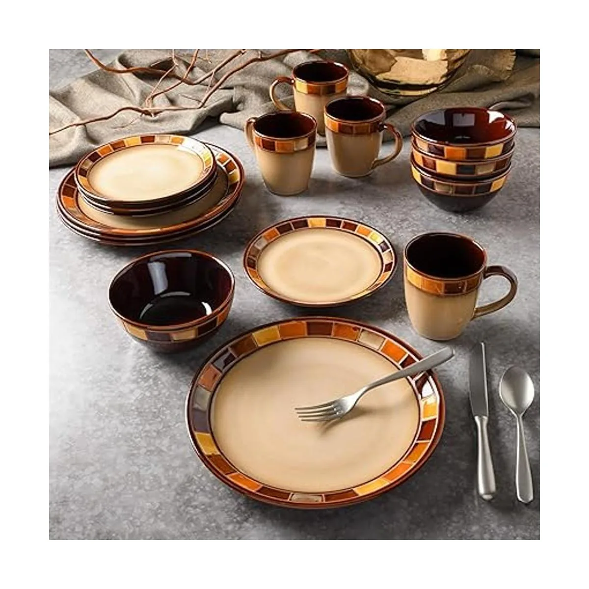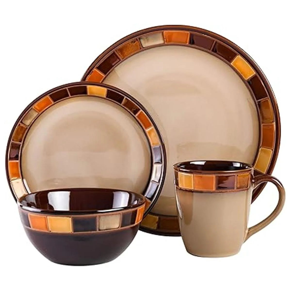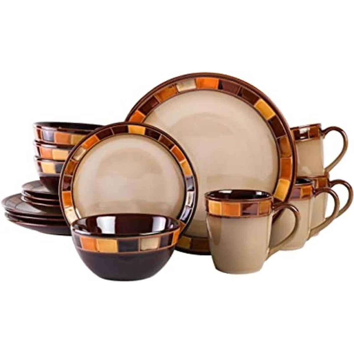 Juego de vajilla de 16 piezas Casa Azul de Gibson Elite, hecho de esmalte reactivo, en color crema y azul, Marrón