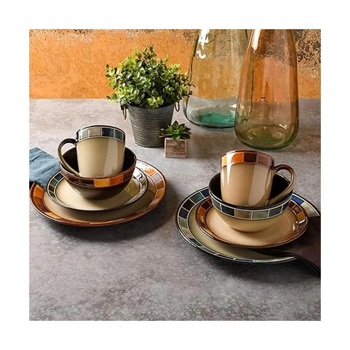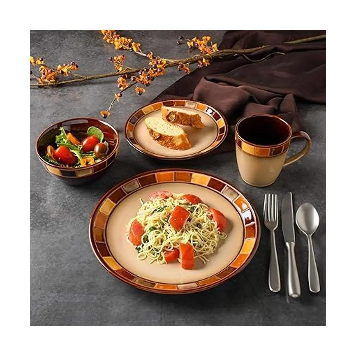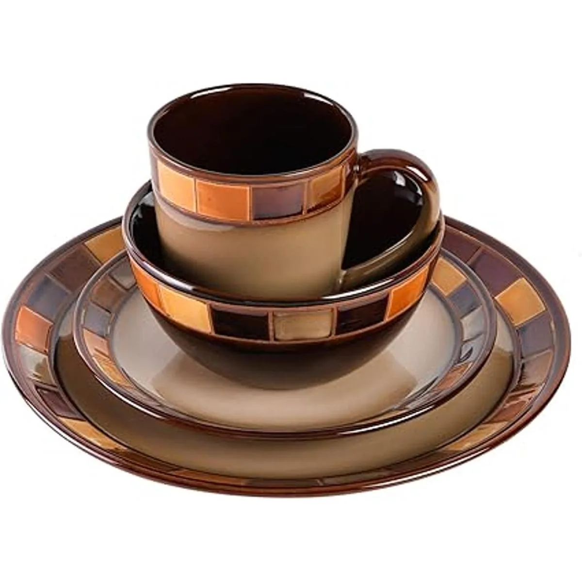 Juego de vajilla de 16 piezas Casa Azul de Gibson Elite, hecho de esmalte reactivo, en color crema y azul, Marrón