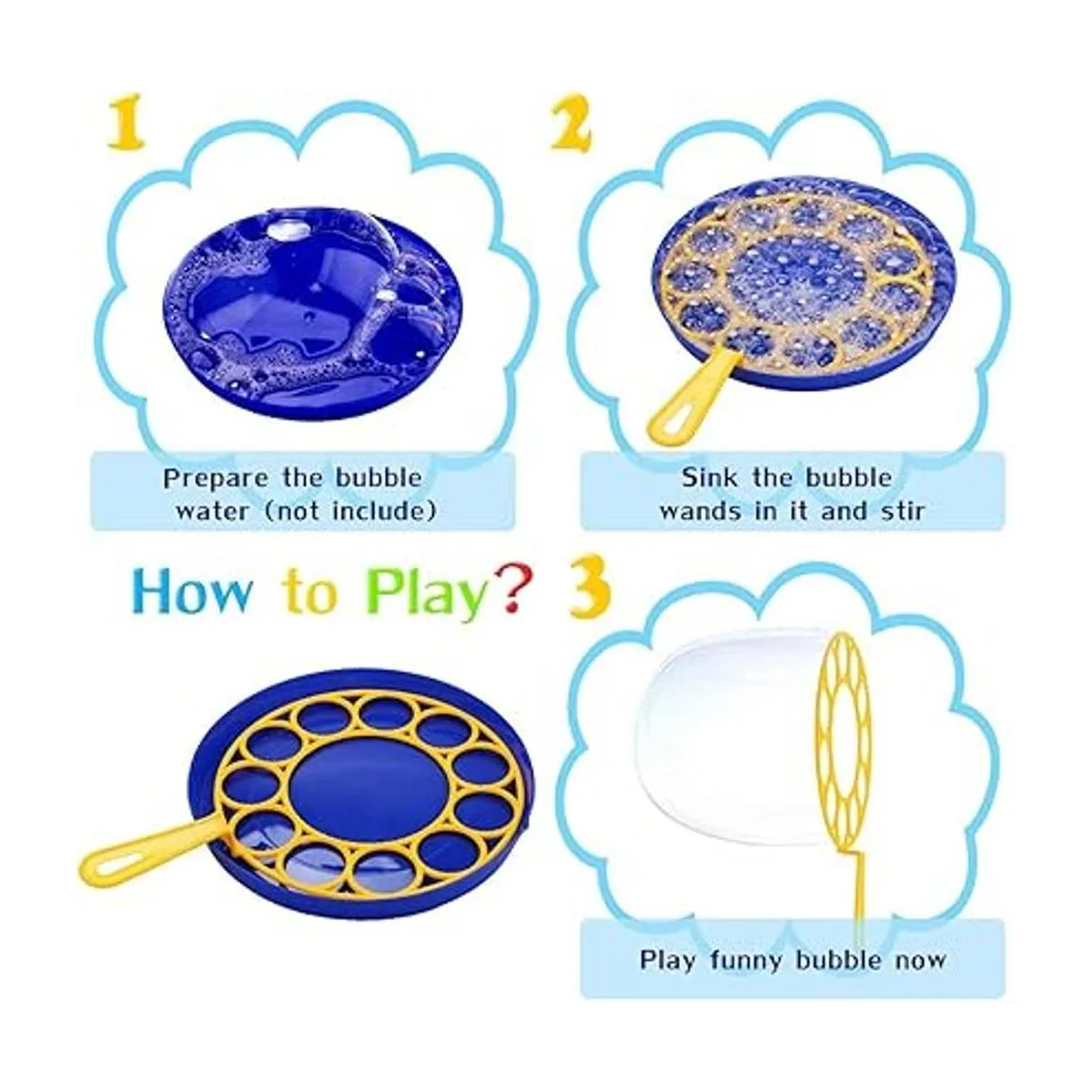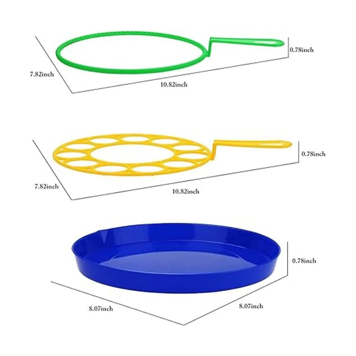 Dimensiones de los juguetes para hacer burbujas: bandeja de burbujas azul marino: 8.1 x 0.8 in; varita de burbujas amarilla/verde: 10.8 x 7.3 in, 2 unidades