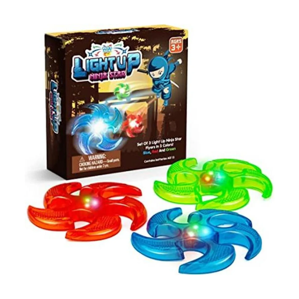 Juego de volantes Ninja iluminados, 3 estrellas electrónicas LED, discos de lanzamiento de goma resistente, juguetes divertidos e interactivos para niños, para lanzar, juegos y jugar, 3 colores, incluye caja de regalo