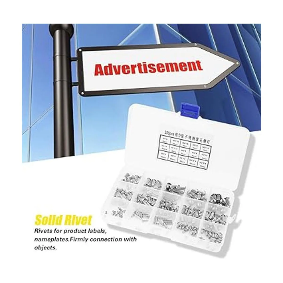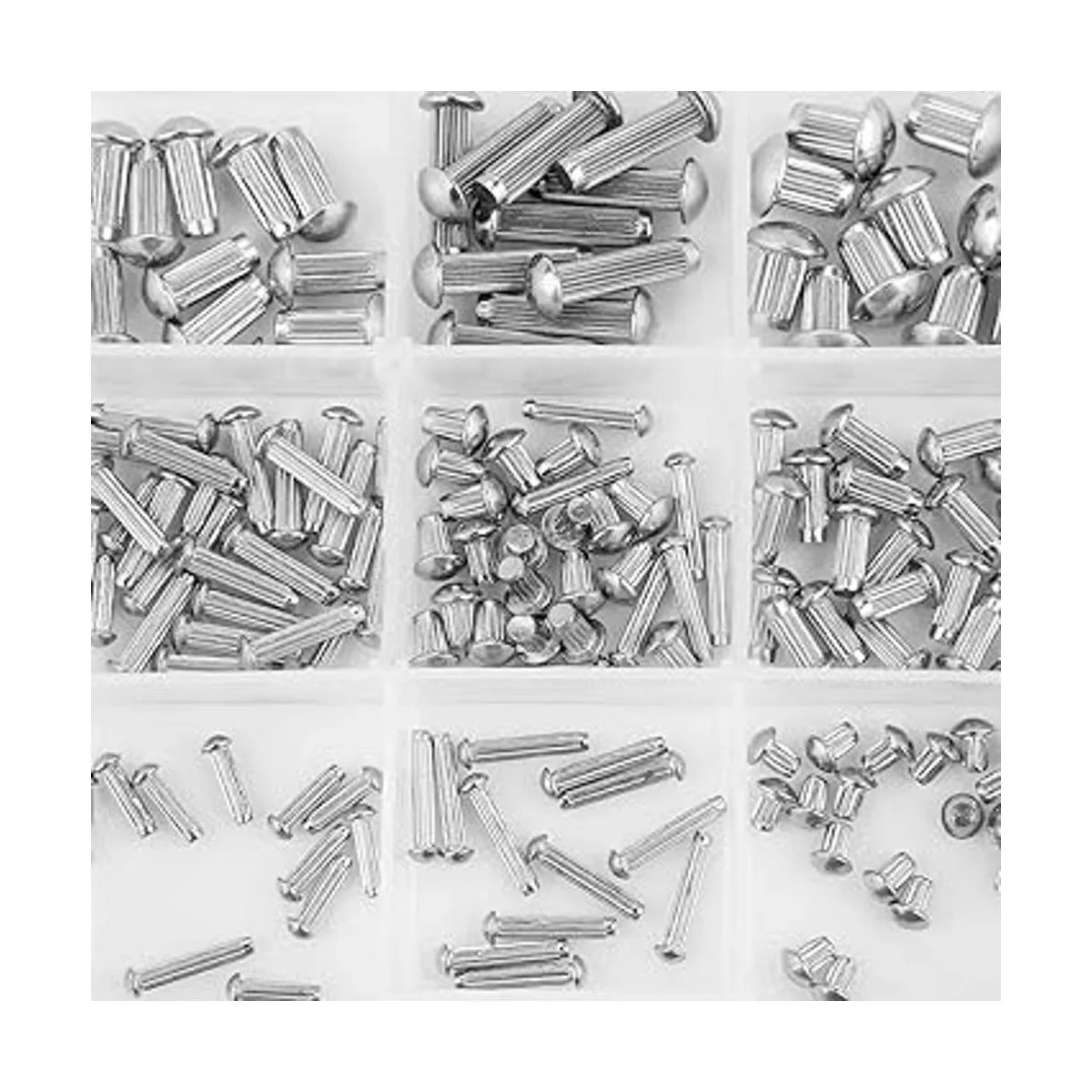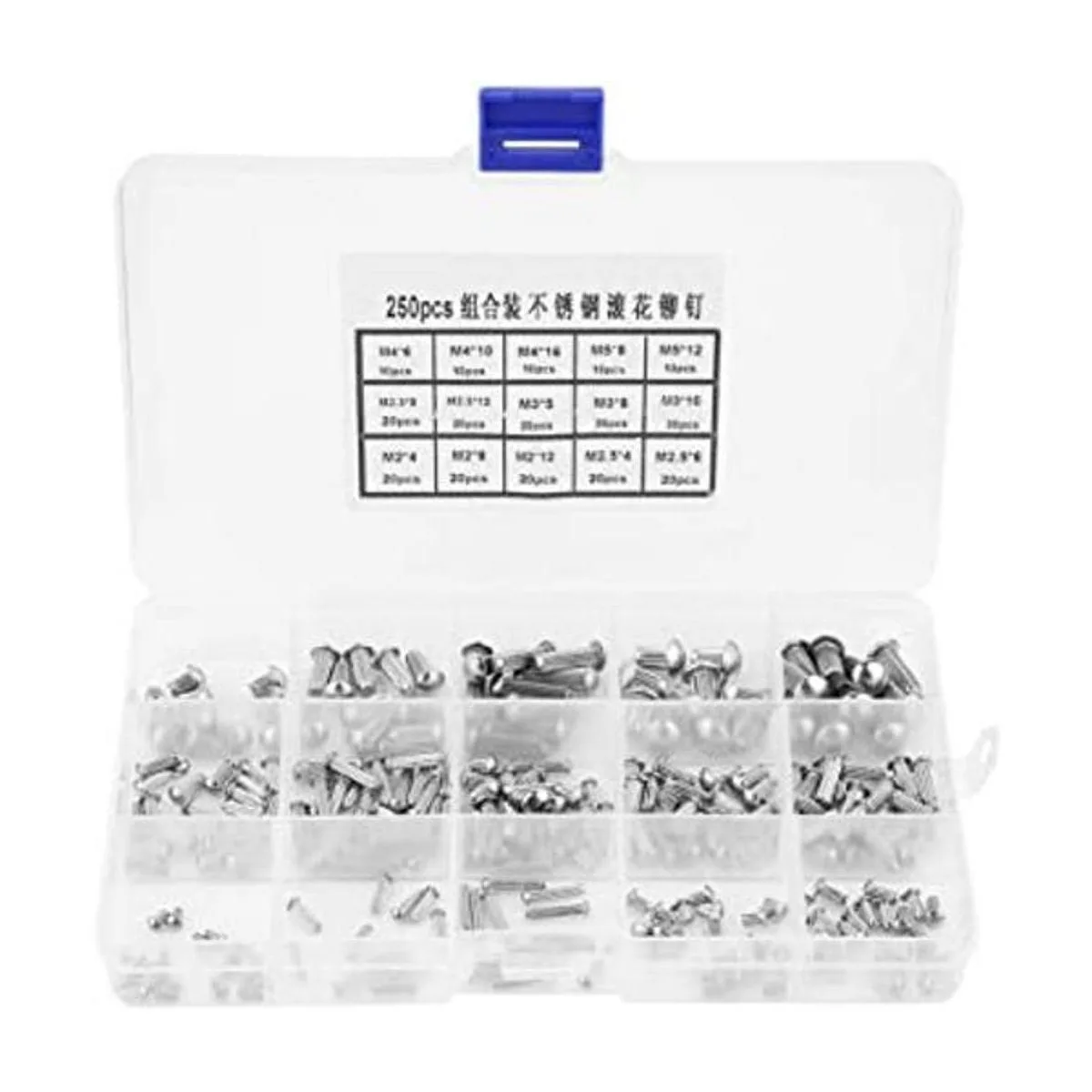 Juego surtido de 250 remaches sólidos moleteados M2 M3 M4 M5 de cabeza redonda de acero inoxidable con remaches sólidos con caja de almacenamiento