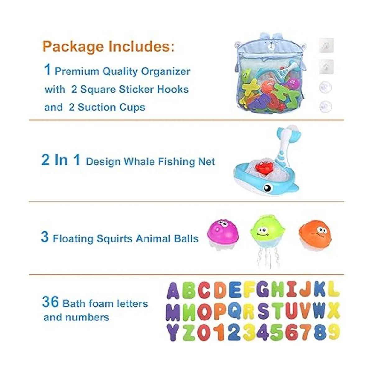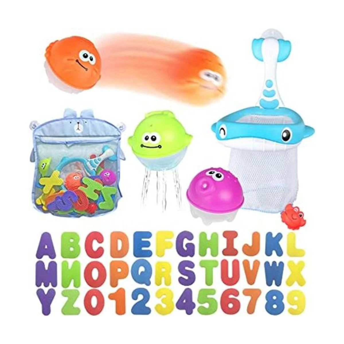 Juegos de juguetes de baño que incluyen: 26 letras AZ, 10 números 09, 3 bolas flotantes de animales, red de pesca multifuncional aro de baloncesto y bolsa organizadora.