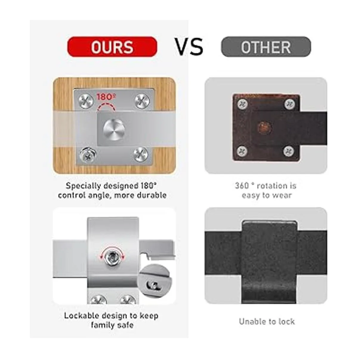 Diseño único: este pestillo de puerta de granero especialmente diseñado tiene sus características únicas. En comparación con los cierres giratorios de 360 grados y fácilmente dañados en el mercado, se puede fijar a 180 grados. Por lo tanto, se puede utilizar más de 10000 veces después de la prueba. Además, tiene una función de diseño adicional que puede bloquear la puerta completamente cuando sea necesario. Ya no te preocupes por ser abierto accidentalmente por criaturas. Nota: Uno de los tornillos es diferente de los otros tornillos. Instálalo en la esquina inferior derecha o inferior izquierda consulta las instrucciones y las imágenes en el sitio web para bloquear su rango en un rango fiable de 180 grados. Garajes, etc.