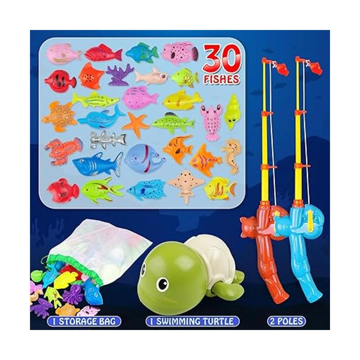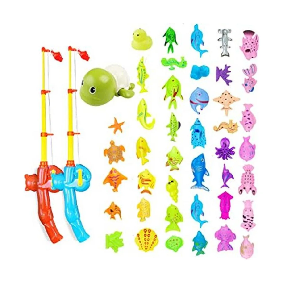 El juego de 33 piezas incluye 2 bastones de pesca telescópicos de plástico con carretes de trabajo; 1 tortuga de natación enrollable; y 30 objetivos equipados con imán en forma de peces, conchas, estrella de mar, delfines, pulpo, langostas y mucho más. También incluye una bolsa de malla para su almacenamiento y secado.