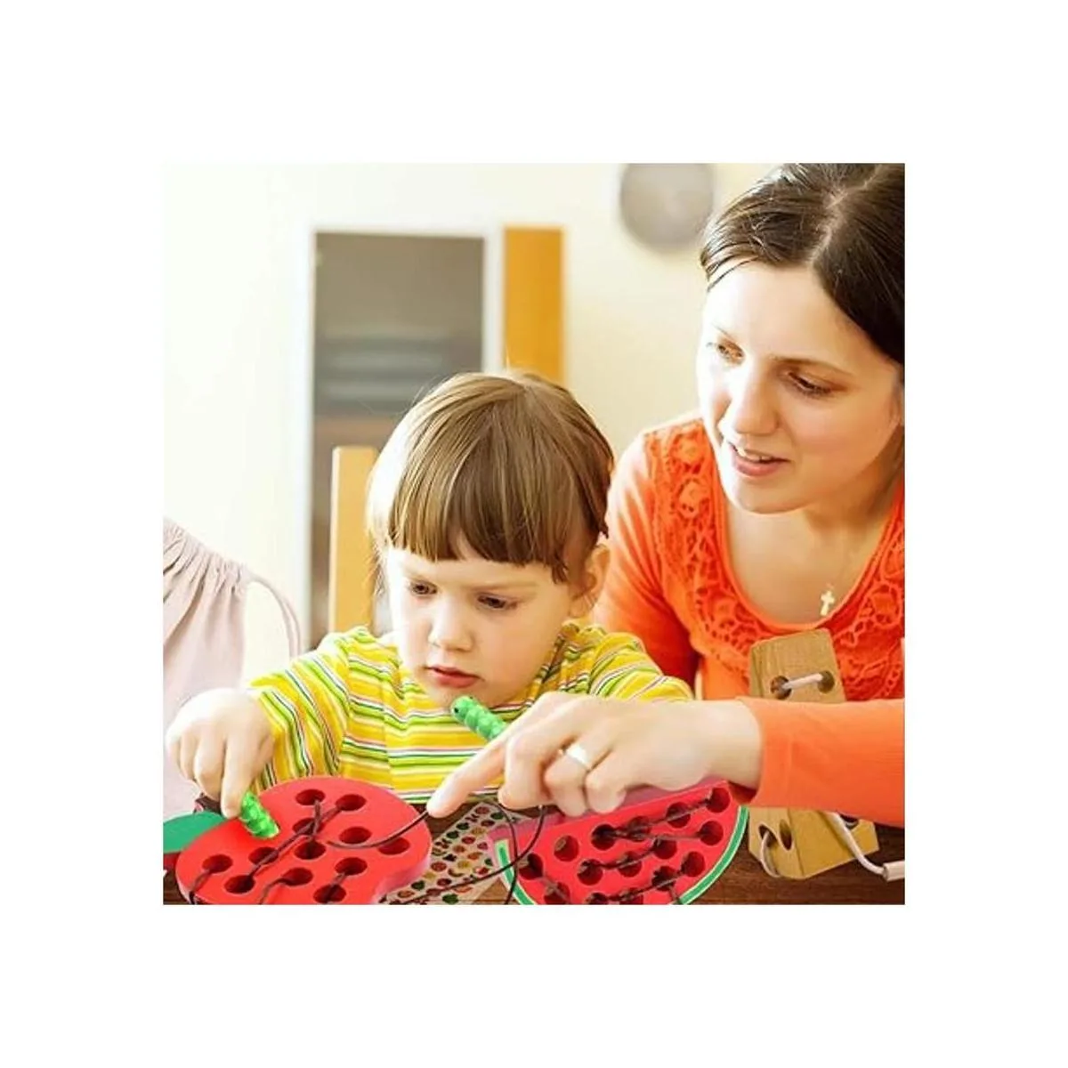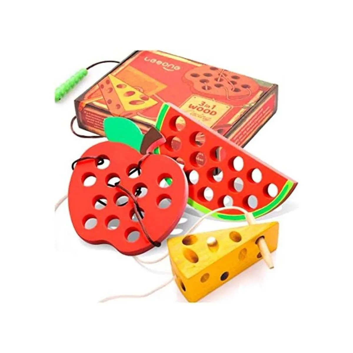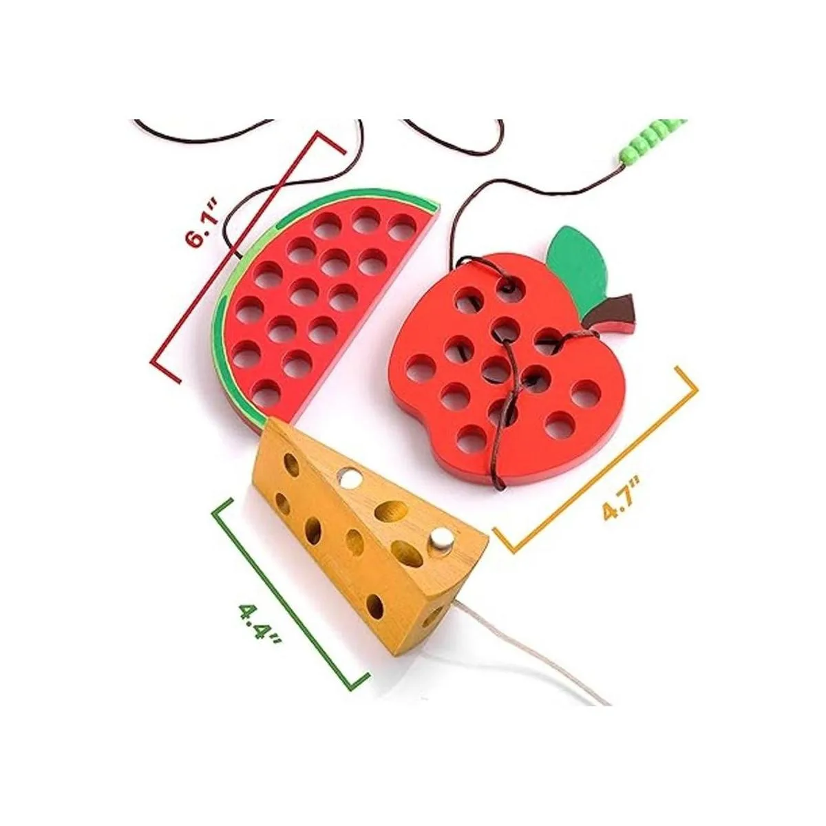 Juguete de cordones para niños pequeños, juguetes de habilidad motora fina para niños de 3 años, aprendizaje educativo Montessori actividad para bebés, juegos de viaje en avión de automóvil, juguetes de enhebrado de madera, 1 manzana, 1 sandía, 1 queso.