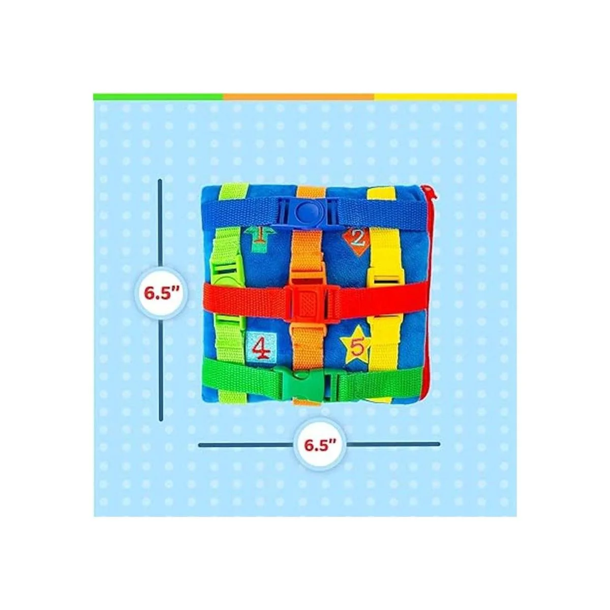 Juguete sensorial: enseña a tu niño o niña bebé, niño pequeño, preescolar, preescolar, jardín de infantes habilidades de la vida temprana con un bolsillo con cremallera, números y formas bordados, y 6 hebillas coloridas. Tamaño: 6.5 x 6.5 pulgadas