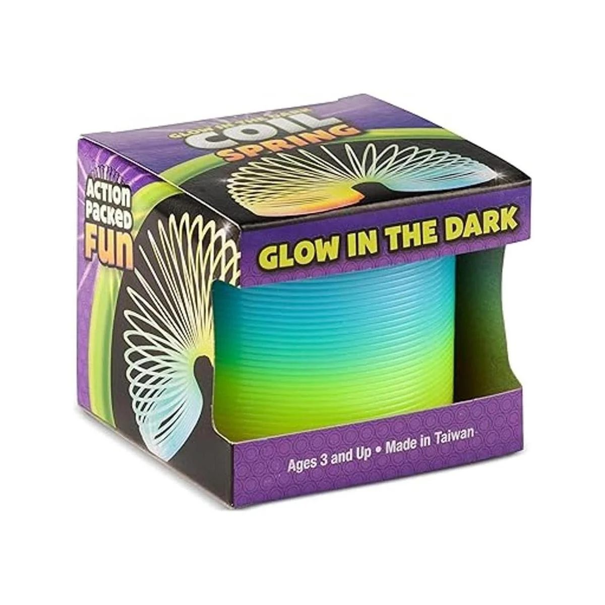 Paquete de 4 resortes de bobina de 3.0 in que brillan en la oscuridad: un giro que brilla en la oscuridad para un juguete clásico. Cada pedido incluye un total de 4 a 3 pulgadas 3.150 in que brilla en la oscuridad empaquetado en una colorida caja táctil. Este resorte mágico está hecho de plástico y los hermosos colores del arco iris seguro que mantendrán tu atención. Exponga el resorte helicoidal a la luz del día y luego baja las luces para verlas brillar