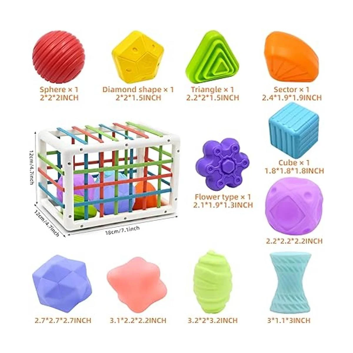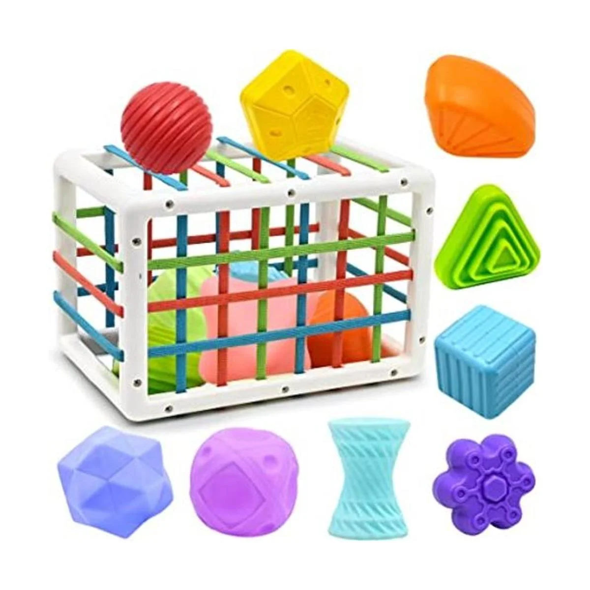 Concepto de juguete abierto: este juguete clasificador de forma de bebé se compone de una caja sensorial con bandas elásticas de colores, 5 bolas de silicona suave para niños y 6 bloques de construcción sensoriales fáciles de agarrar. Los bebés aprenderán a sacar los juguetes y luego reemplazarlos, no solo desarrollan sus habilidades de resolución de problemas y reconocimiento de color de forma, sino también habilidades motoras finas y destreza.