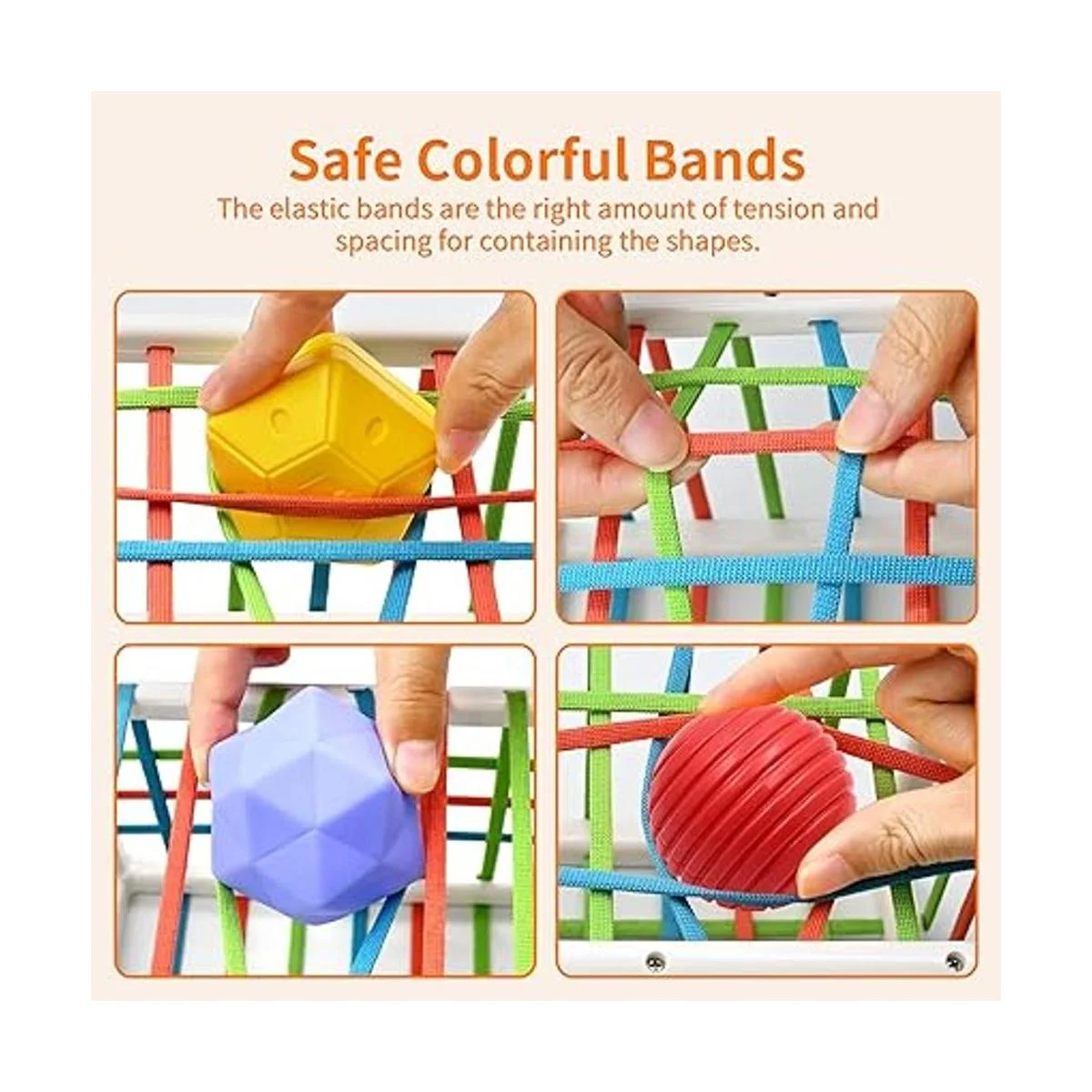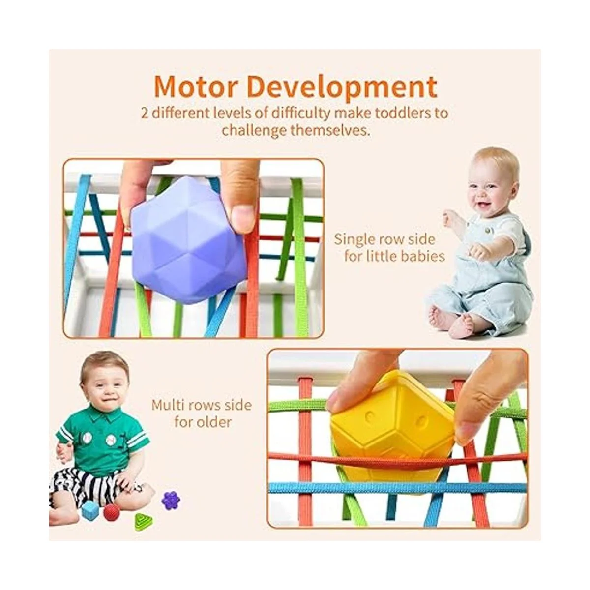 Desafío de 2 niveles diferentes Nuestro contenedor sensorial para bebé es rectangular con bandas elásticas cubiertas de tela suave, los bebés pequeños pueden aprender a pasar los juguetes por un solo lado, luego crecer con esas múltiples filas para desafiarse a sí mismos, por lo que este es definitivamente un juguete que crecerá con 10 meses de edad y durará.