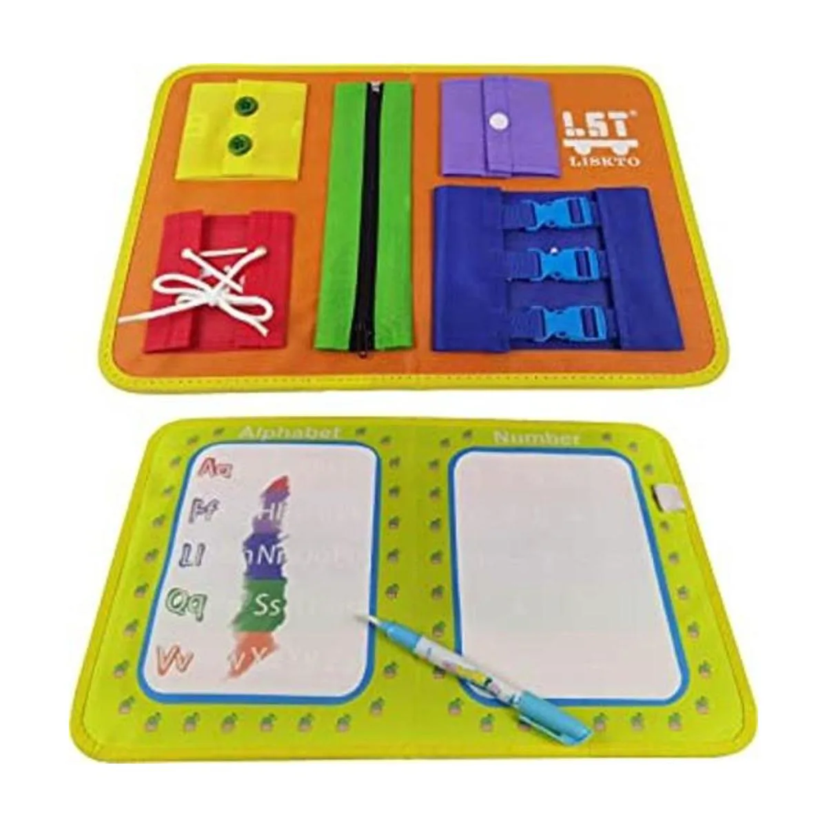 Juguetes de aprendizaje para vestidos de mesa ocupada incluyendo botón, corbata, broche de presión, hebilla y cremallera, tapete mágico con alfabeto y número para que tus hijos practiquen el alfabeto y el rastreo de números