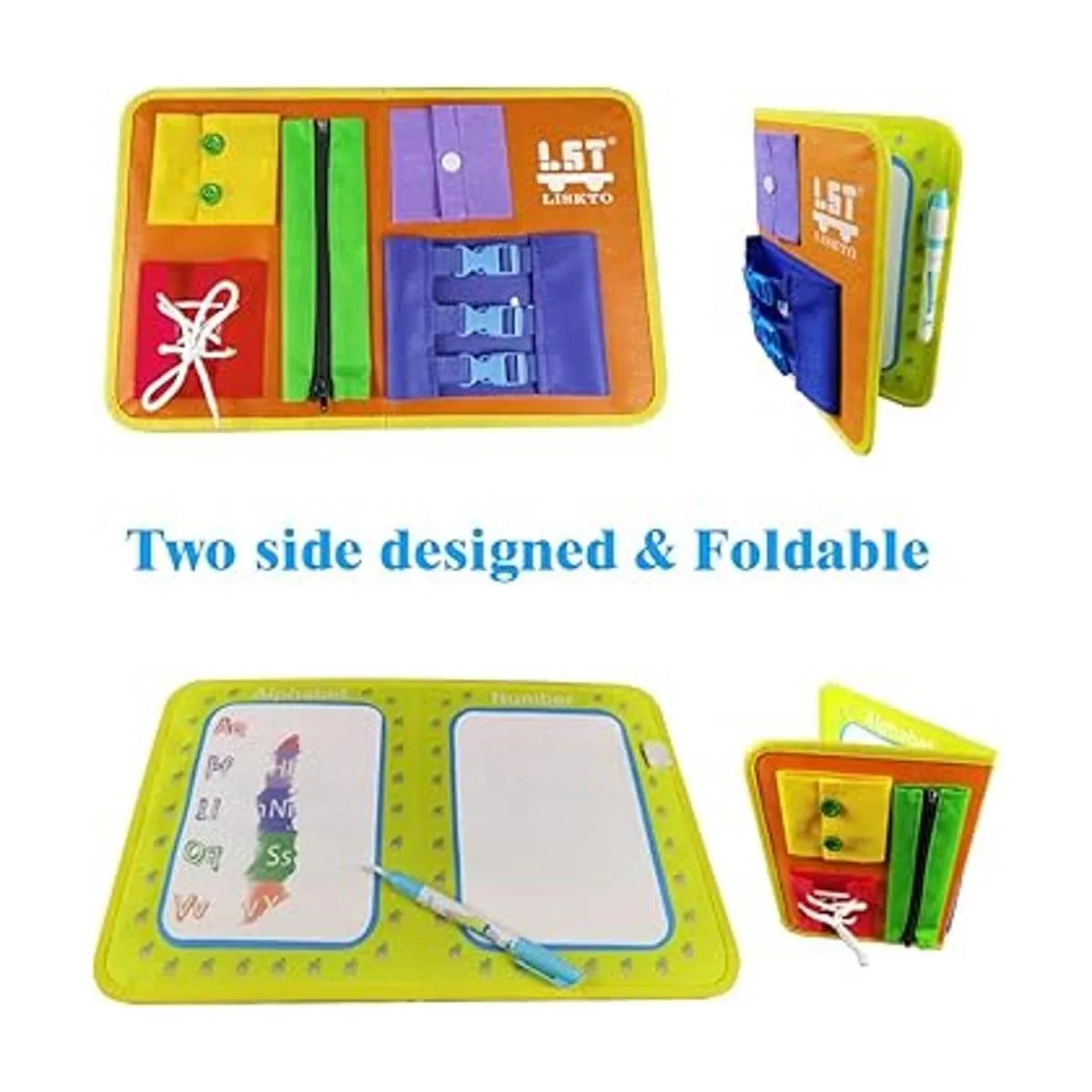 Diseño innovador de dos lados: la parte delantera es una tabla ocupada que incluye una hebilla, botón, cremallera, encaje y broche. La parte trasera es una alfombrilla mágica que incluye alfabeto, número y aritmética básica con diseño colorido. Plegable y fácil de almacenar.
