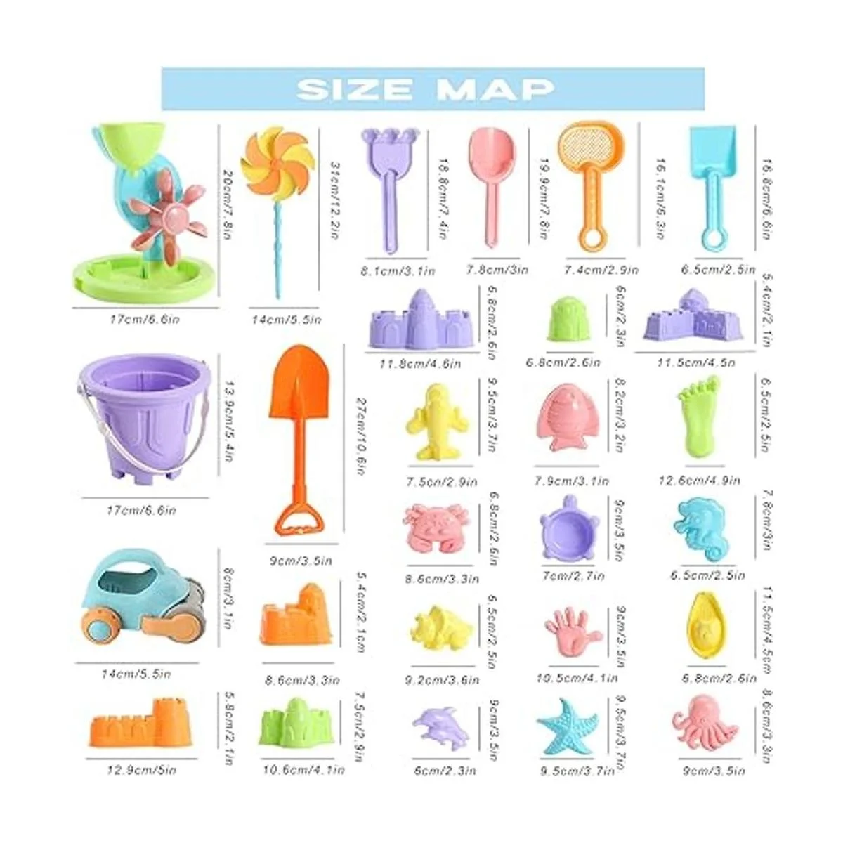 Juguetes de arena de playa todo en uno de 31 piezas: Este juego de juguetes de arena de playa viene con 31 juegos, que incluyen todos los accesorios para un feliz juego de playa. 1 camión de arena, 1 rueda de agua, 1 cubo de arena, 1 molino de viento, 1 cuchara grande, 4 palas, rastrillos y cucharas en diferentes tamaños, 6 moldes de castillo, 12 objetos y moldes de animales, que satisfarán las necesidades del niño para construir o cavar. Un emocionante juego de arena hará que el viaje a la playa sea memorable.