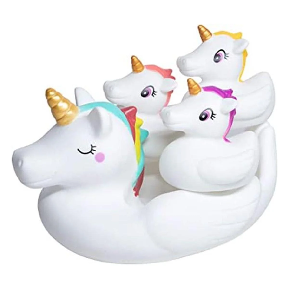 Adorable diseño de unicornio: el juego de juguetes de bañera familiar de unicornio incluye un unicornio madre y tres bebés, qué podría ser más divertido para los pequeños bañadores que colgar en la bañera con una familia de unicornios Traerán un buen estado de ánimo y una risa alegre al bebé y a los niños les encantará bañarse con este juguete de baño en la bañera.