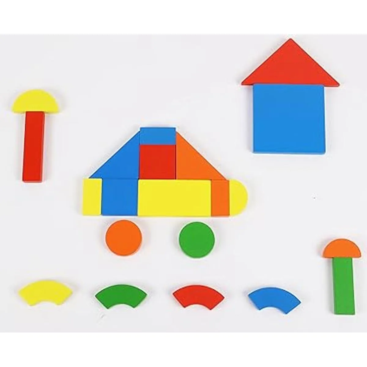 Rompecabezas de tangram de bloques magnéticos de madera grandes 25 piezas coloridas formas geométricas de madera como parte de accesorios para tableros magnéticos Toys of Wood Oxford. Se puede jugar en el tablero del caballete, puerta del refrigerador o solo