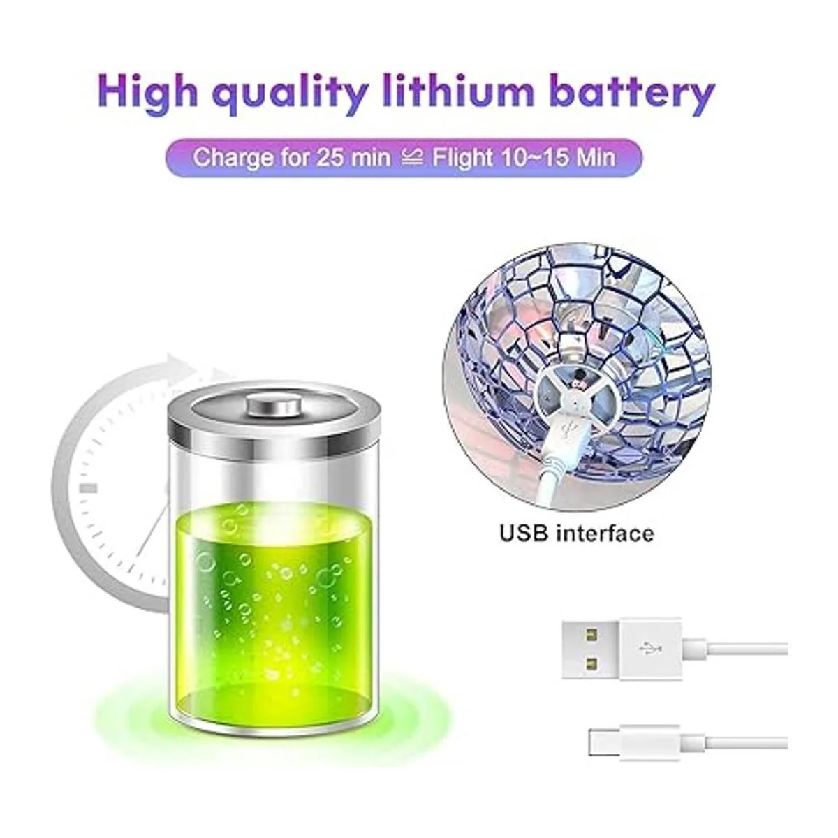 Recargable y portátil : alimenta el orbe del espacio de mosca con cable USB durante 25 minutos y te dará 1015 minutos de tiempo de vuelo. Dondequiera que vayas, la pelota de dron para niños puede llevar fácilmente y no ocupa mucho espacio.