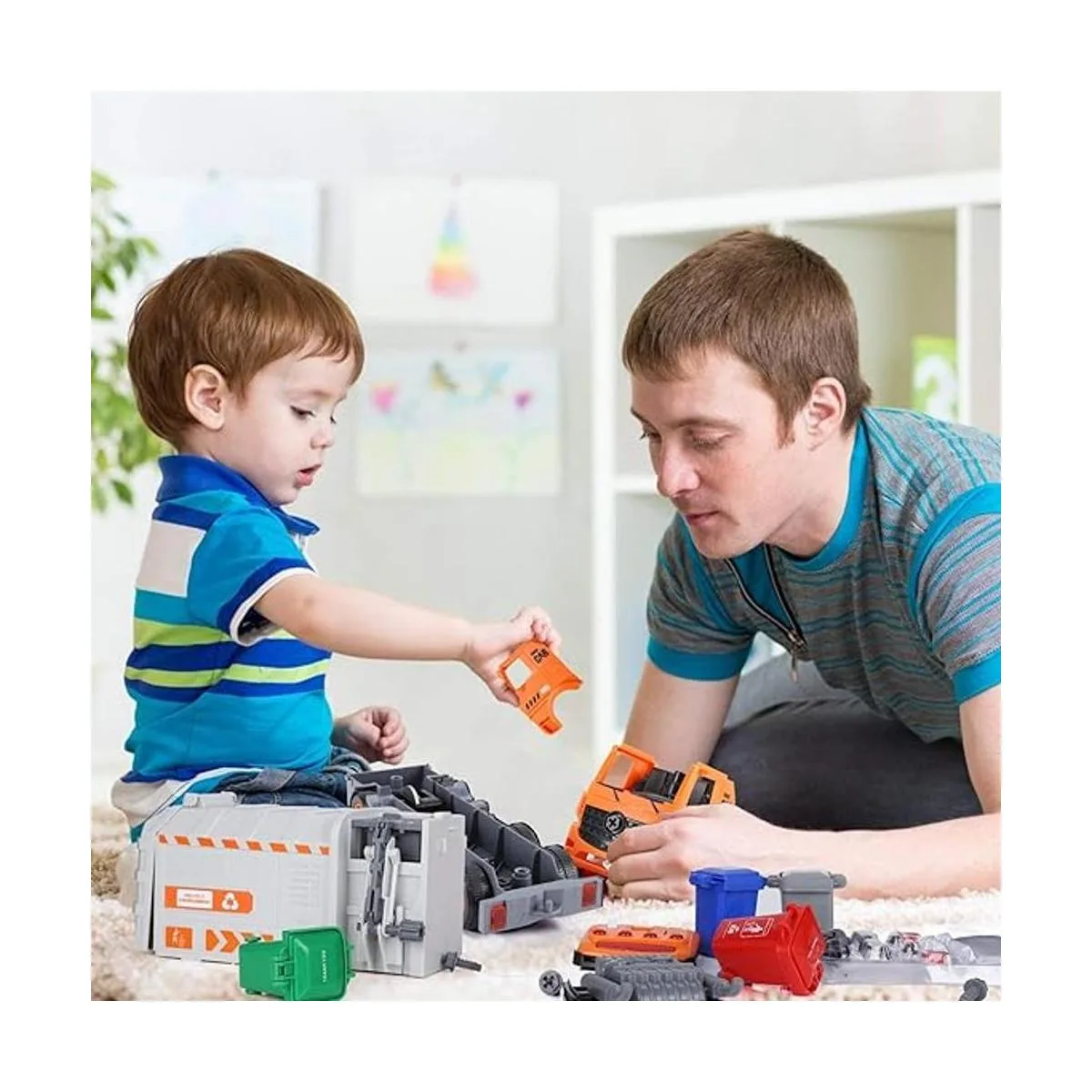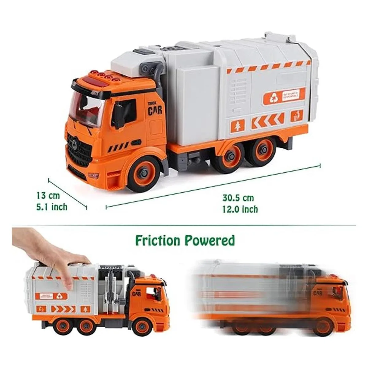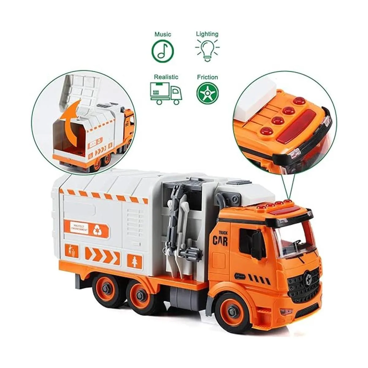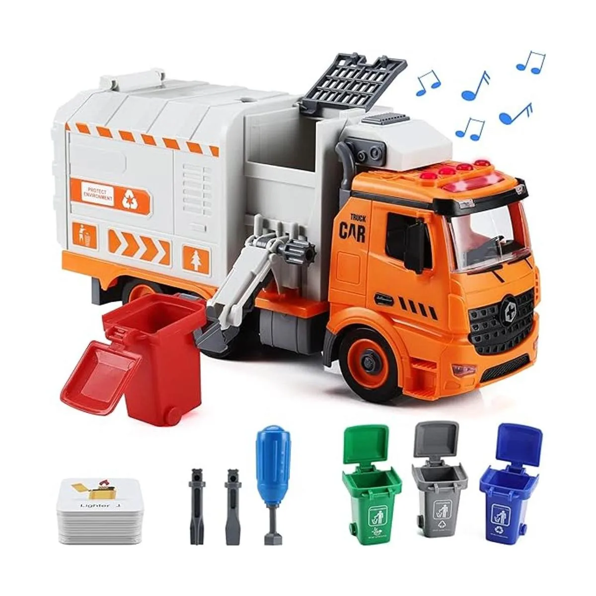 Montaje y desmontaje de bricolaje: este juguete de camión de basura viene con muchos accesorios. Estos pueden hacer el tiempo de juego más divertido y ofrecer más oportunidades para pensamiento creativo y juego imaginativo, con los juegos de destornilladores, los niños pueden montar estos accesorios en un gran camión de basura.