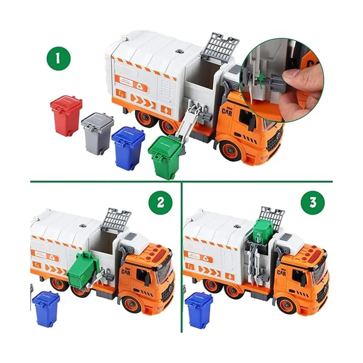 Juguetes de camión de basura DIY con 4 cubos de basura en miniatura, con luces y sonidos como un camión de basura real, regalo de cumpleaños para niños pequeños de 3,4,5, 6 años de edad y más.