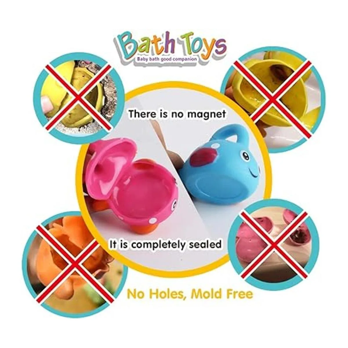 Sin agujeros, sin moho Estos juguetes están completamente sellados, por lo que no tienes que preocuparte por que el agua entre y que cause moho en ellos como los juguetes de goma para apretar el agua. No compres a tu bebé un juguete de goma para apretar, ya que todos los bebés lo primero que hacen son poner todo en su boca cuando se les da un juguete. Imagina lo peligroso que un juguete se enmohece en el interior, pero tu bebé lo mantiene en la boca.