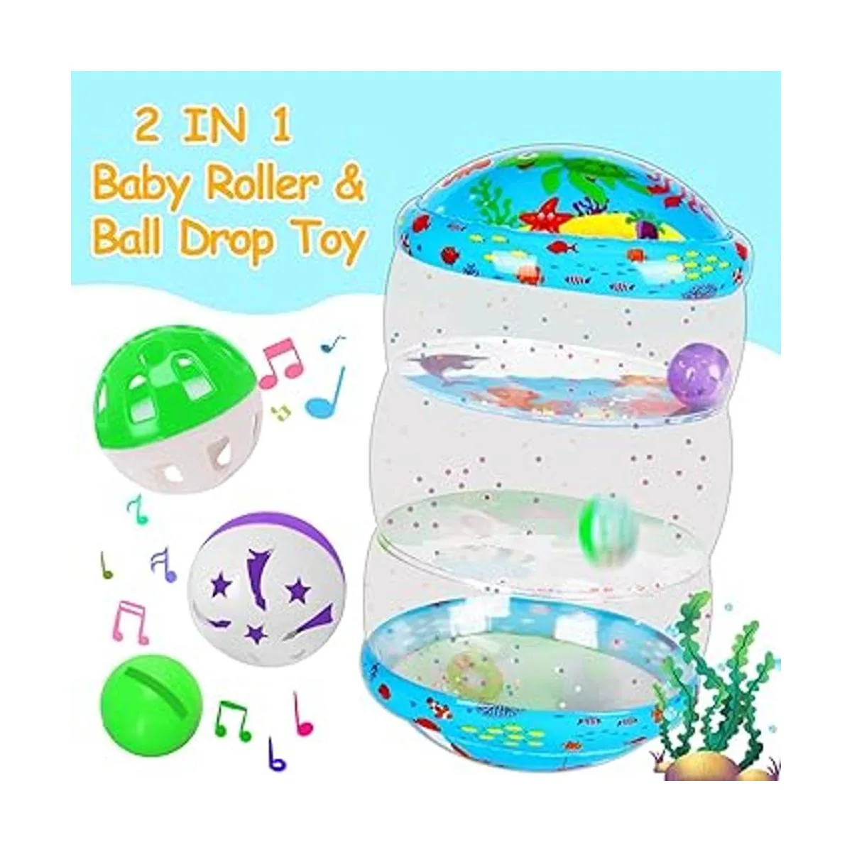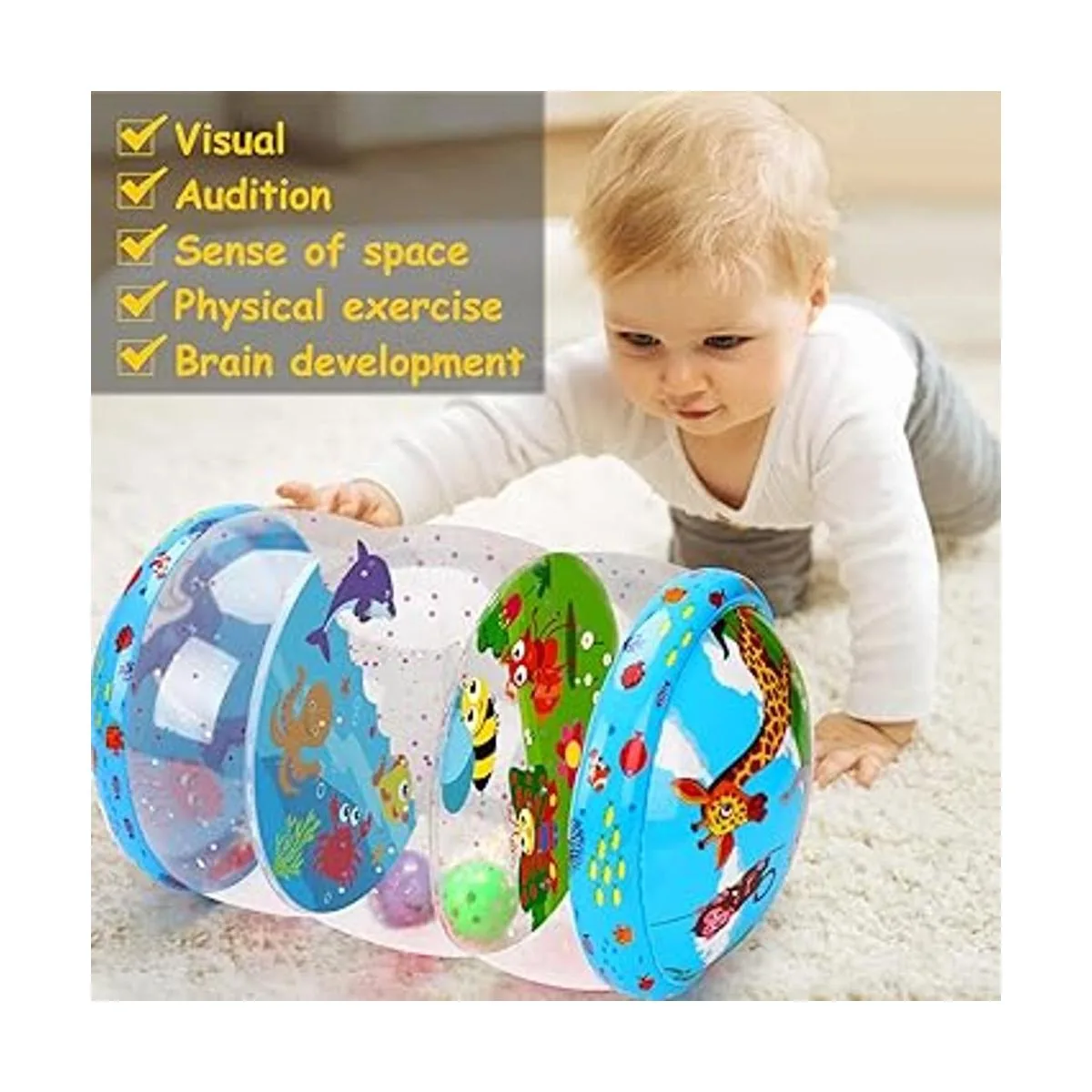 Juguetes de rodillo jumbo para bebés con diseño creativo: nuestros juguetes para bebés cuentan con diferentes animales lindos del mar y la tierra, vienen con dos bolas de traqueteo en el interior. Las bolas de sonido caen de un nivel a otro con lentejuelas frescas a través de los agujeros especiales en el interior. A cualquier bebé que esté gateando le encantará este divertido juguete