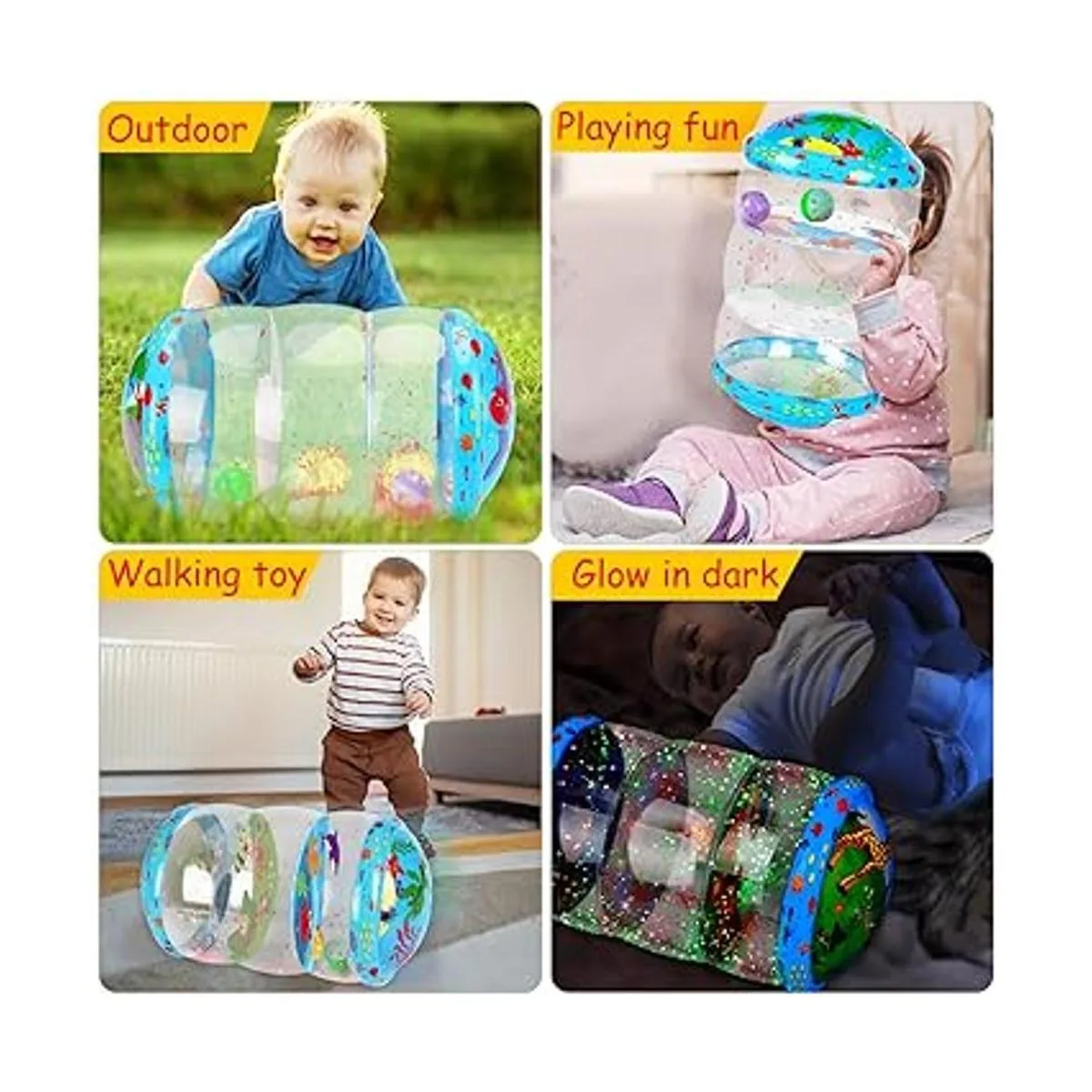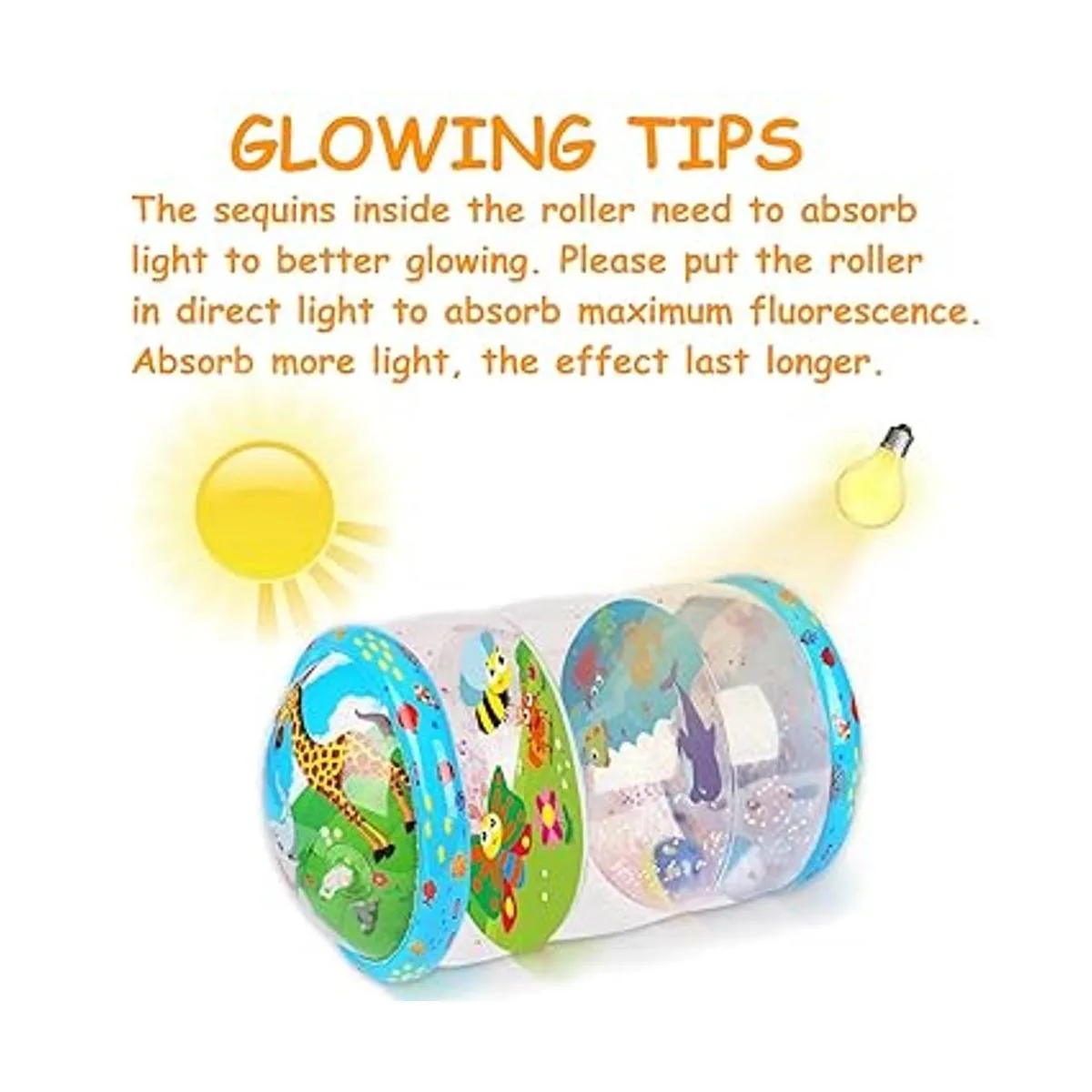 Atractiva lentejuelas que brillan en la oscuridad: este fascinante juguete para bebé contiene un montón de lentejuelas brillantes, para que el bebé pueda jugar por la noche. Las lentejuelas brillantes siguen girando con los rodillos, lo que lo hace más interesante. El bebé sostiene el rodillo con las lentejuelas brillantes en su mano como si estuviera sosteniendo muchas estrellas. Qué juguete mágico