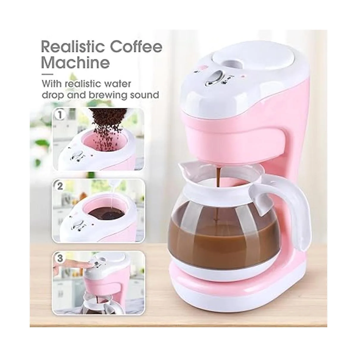 Juego de cafetera realista para niños: la cafetera prepara agua segura, no calentada. Vierte agua en la cafetera, pulsa el botón de voz para simular el sonido de la ebullición de agua, y luego pulsa el botón del interruptor, el agua en la cafetera se puede verter en la cafetera, y nuestro café está terminado
