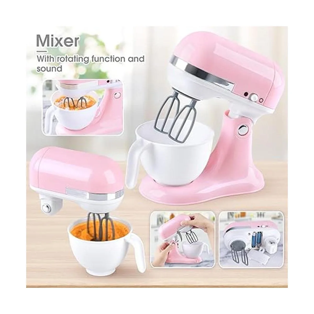 Mezclador de juguete que funciona: mezclador giratorio, que se puede utilizar para hacer alimentos reales. Por ejemplo, puedes indicarle a tu hijo que agregue huevos, harina y leche en la licuadora para hacer deliciosas galletas. Gira el interruptor mezclador al círculo negro y el mezclador puede empezar a funcionar.