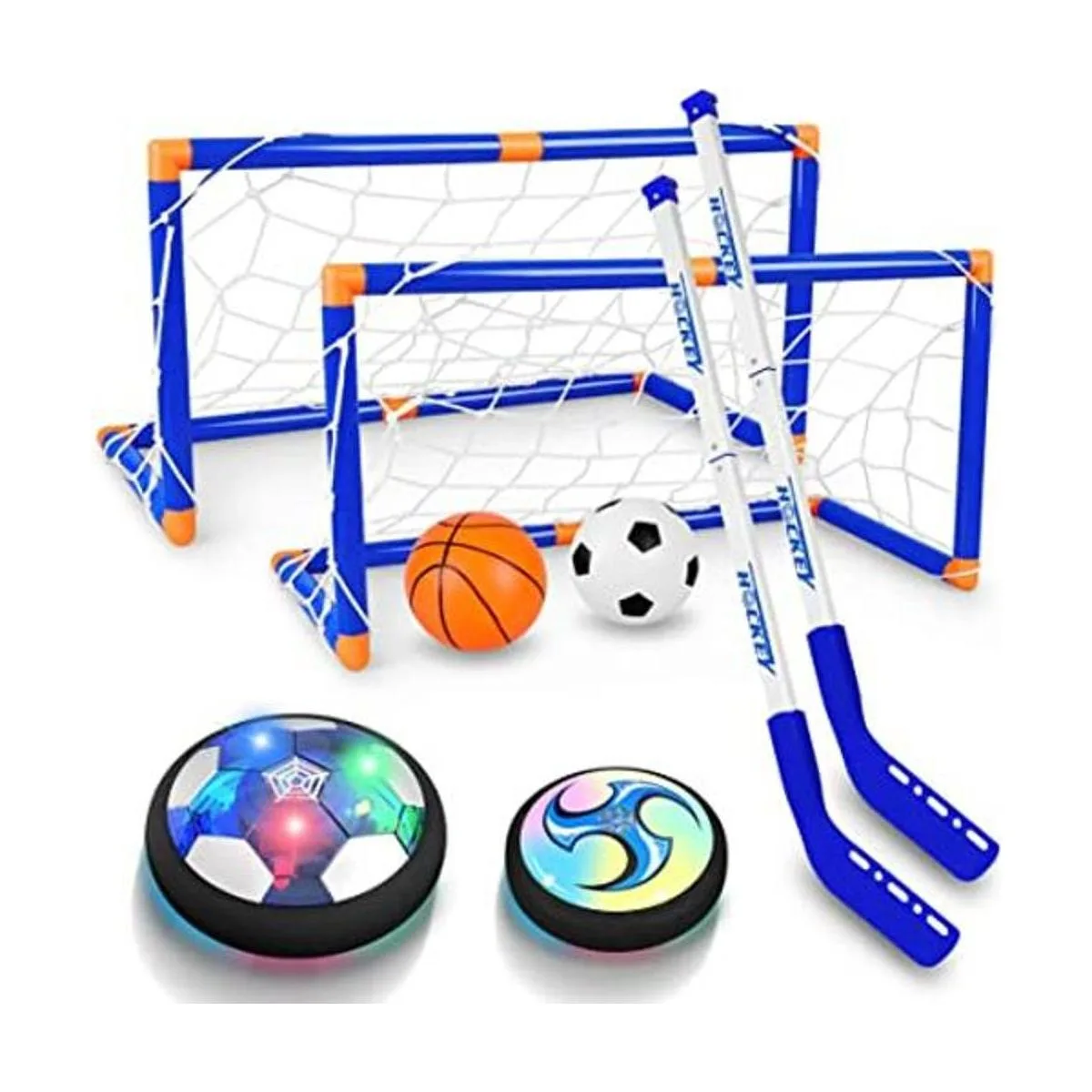 Valioso juego de hockey para niños: incluye 2 pelotas de fútbol recargables, sin necesidad de baterías, 1 fútbol inflable y 1 baloncesto inflable, infla la pelota con la bomba, 2 palos de hockey, 2 porterías y 1 cable recargable, un mini destornillador