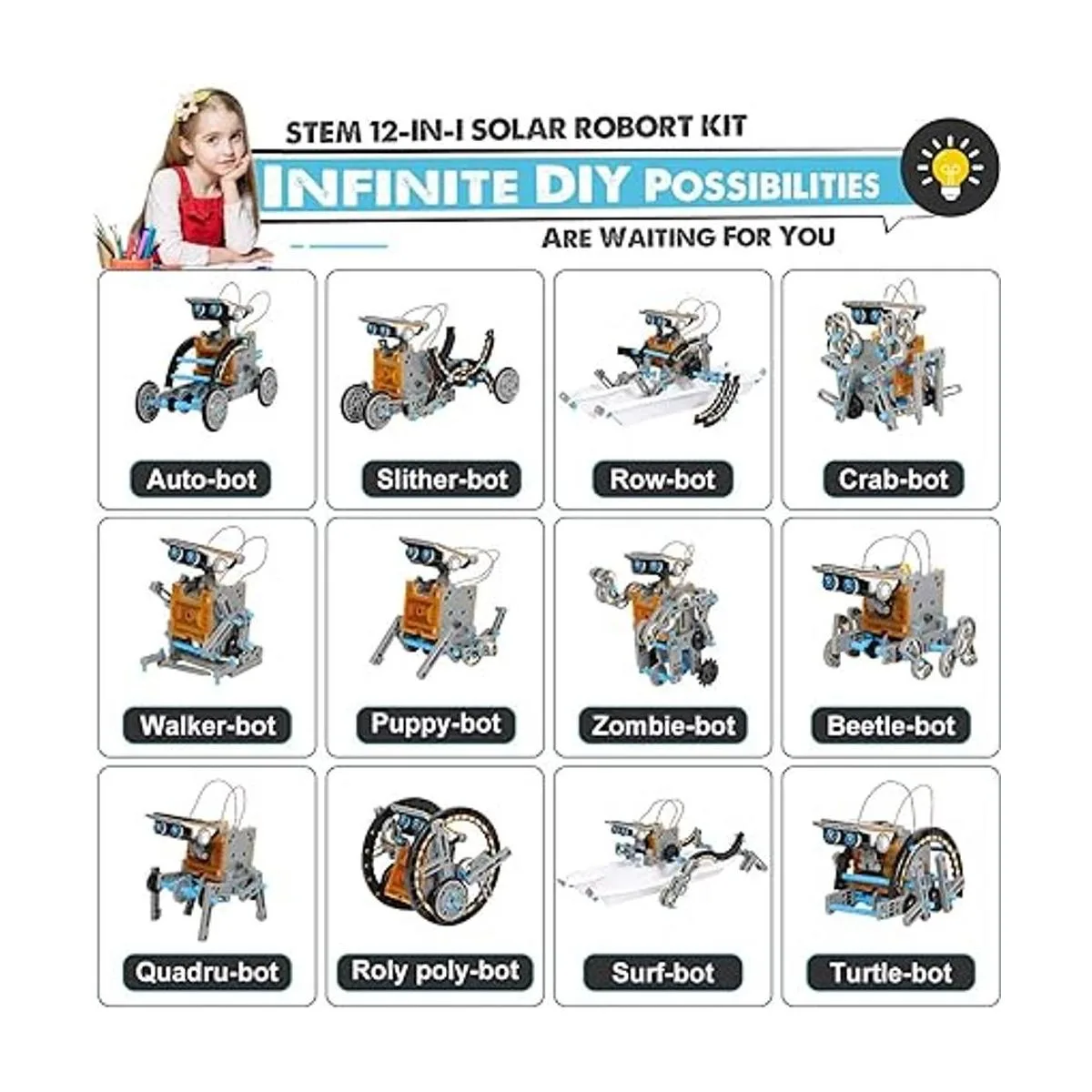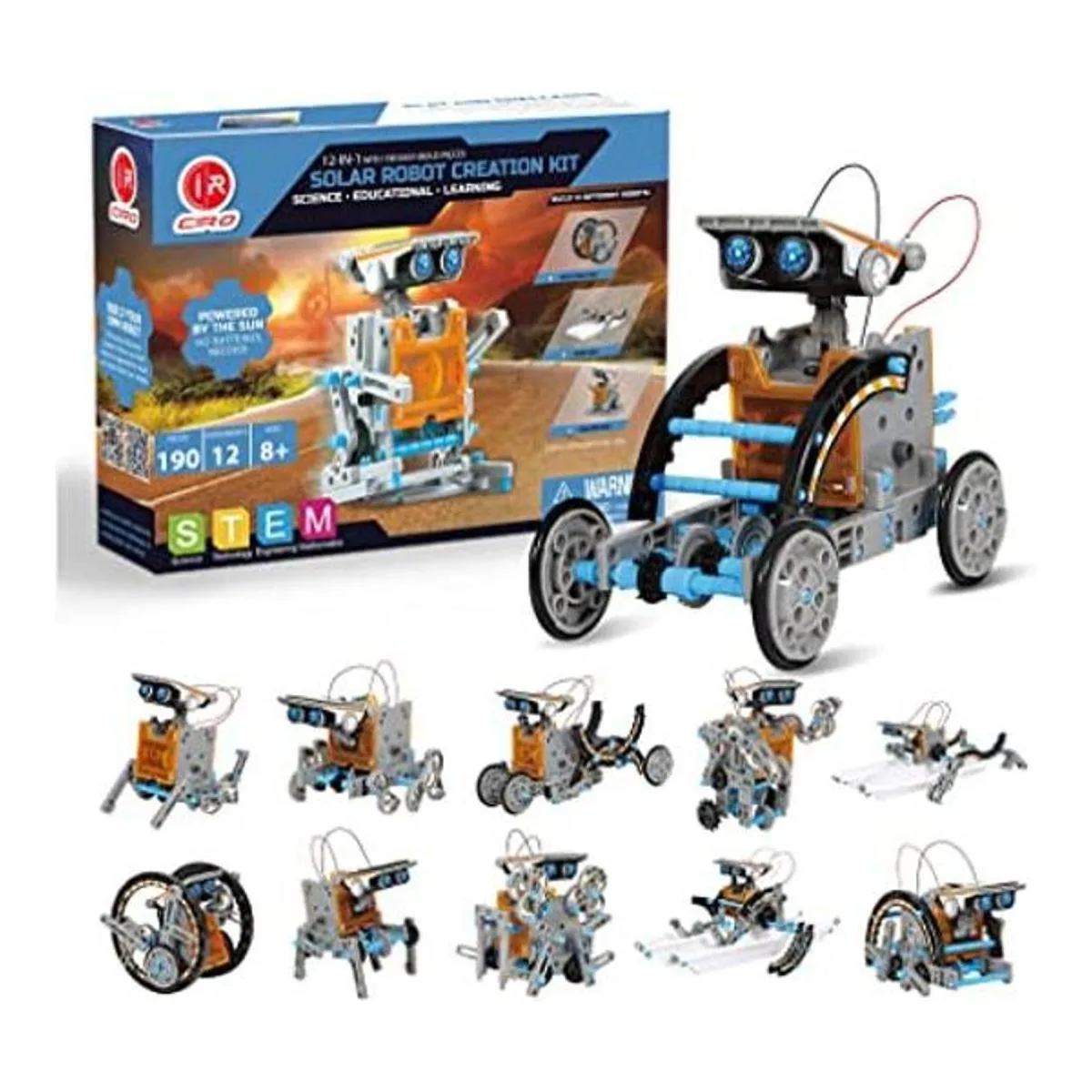 Kit de robot solar 12 en 1: este kit de robot solar se puede construir en 12 formas diferentes de robots. Se compone de 190 piezas, incluyendo piezas móviles y de conexión como engranajes, placas, neumáticos y ejes. Los niños pueden desmontarlos fácilmente después de la construcción de cada robot.