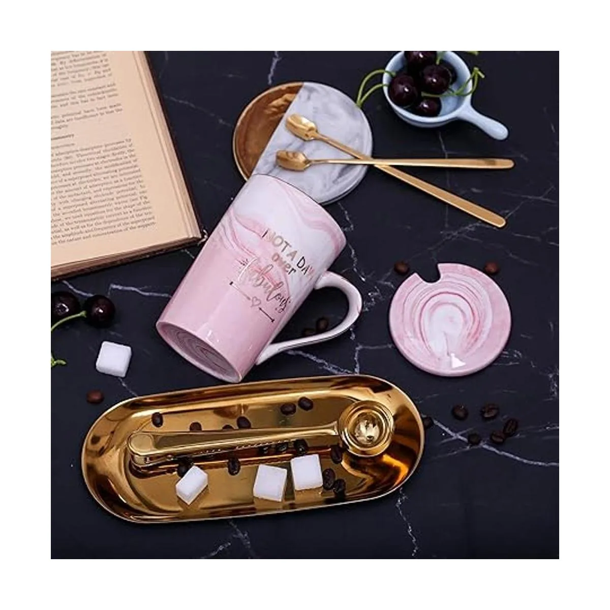 Embalaje en caja de regalo: todo lo que obtienes se muestra en la imagen. 2. Viene en un elegante embalaje con interior acabado de seda. Este artículo está listo para regalar. No hay necesidad de volver a empacar. 1 taza de 14 onzas, 1 tapa de taza, 1 cuchara, 1 posavasos absorbente, 1 tarjeta de felicitación rosa puedes escribir tus bendiciones a tus amigos. Tazas de tamaño más grande y más accesorios ofrecidos, satisface tus necesidades de beber café o regalo