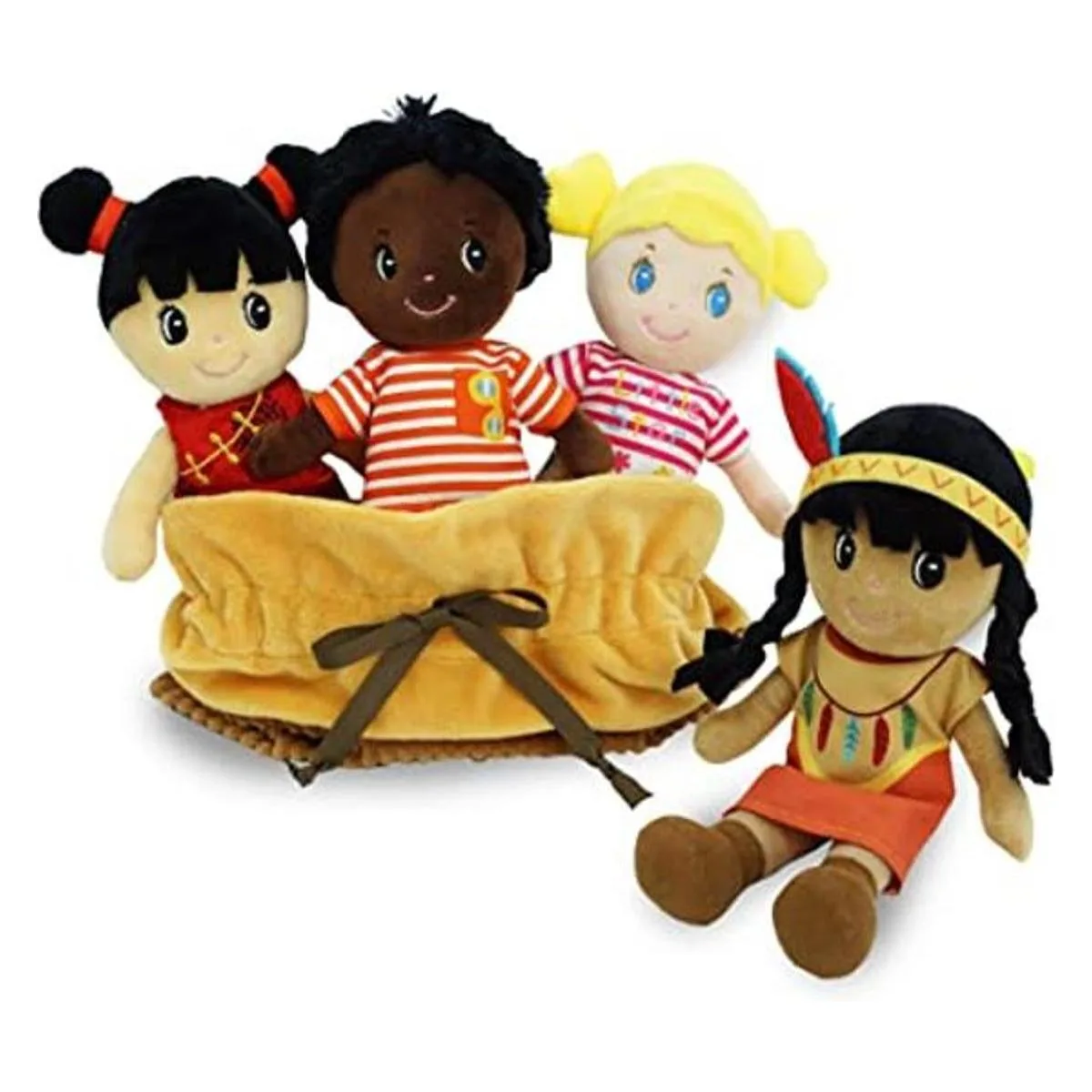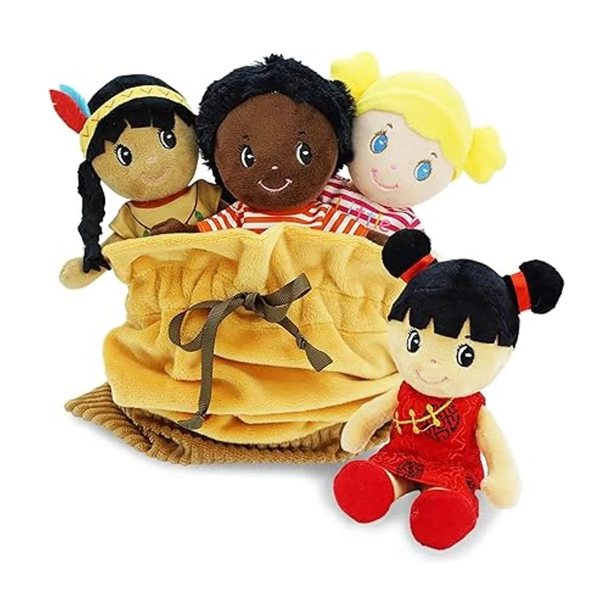 Muñecas de bebé suaves multifuncionales: el juego de peluche incluye 4 muñecas de peluche culturalmente diversas con diferentes atuendos que representan diferentes culturas y una práctica bolsa de almacenamiento de juguetes.