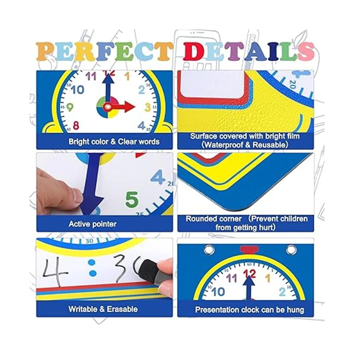 Borrable y reutilizable: adopta laminado de calidad, el reloj de práctica para el tiempo de aprendizaje es fácil de limpiar, hace que sea fácil para los estudiantes leer y entender, desarrollar habilidades matemáticas básicas mientras añaden, restan y cuentan minutos y horas; lo que es más, las manecillas de hora y minutos pueden girar para permitir que el niño marque la hora