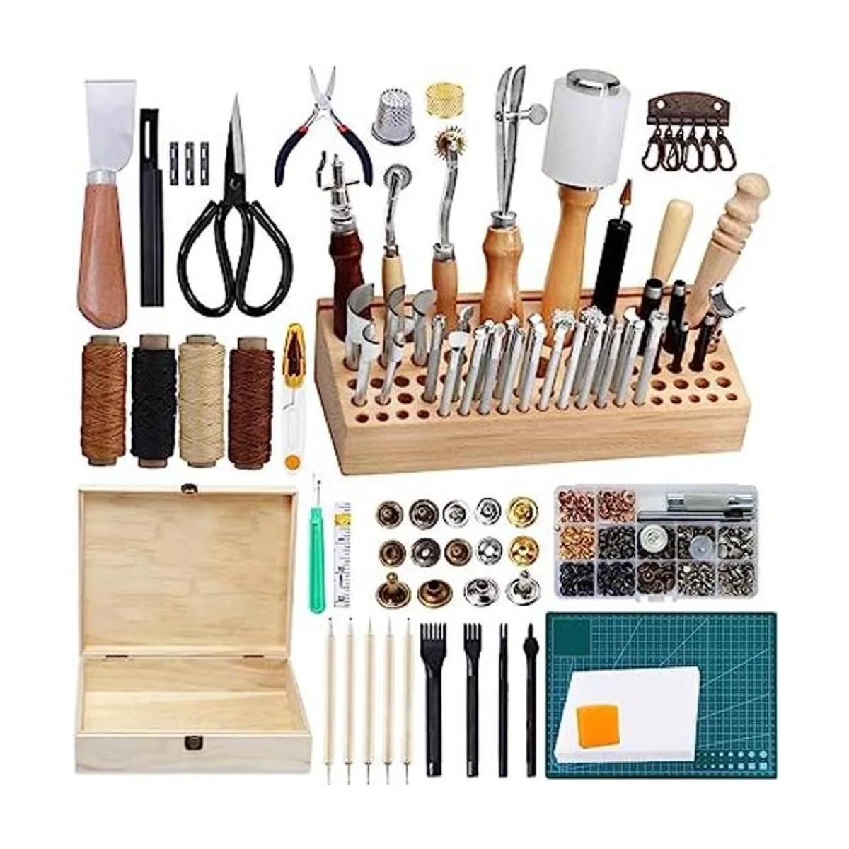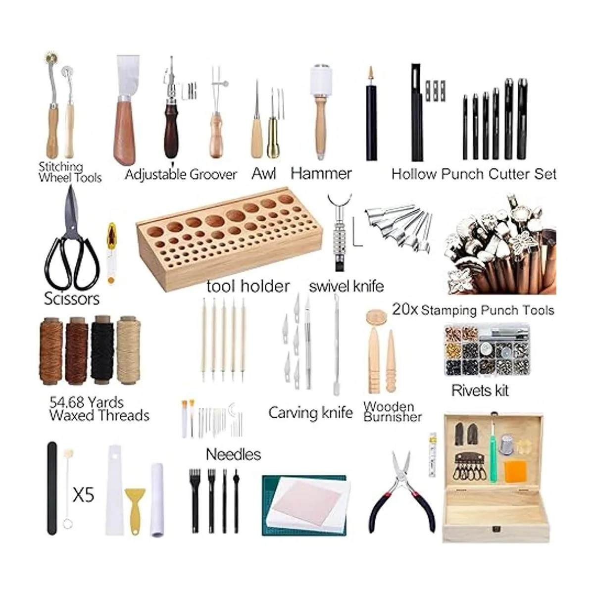 Caja de herramientas de cuero profesional resistente: el kit de herramientas de cuero con una caja de herramientas de madera profesional y soporte de herramientas de manualidades de cuero es conveniente para mantener las herramientas ordenadas y ir a cualquier lugar con herramientas de manualidades de cuero. Los accesorios de cuero están incluidos en esta caja de herramientas de cuero de madera.