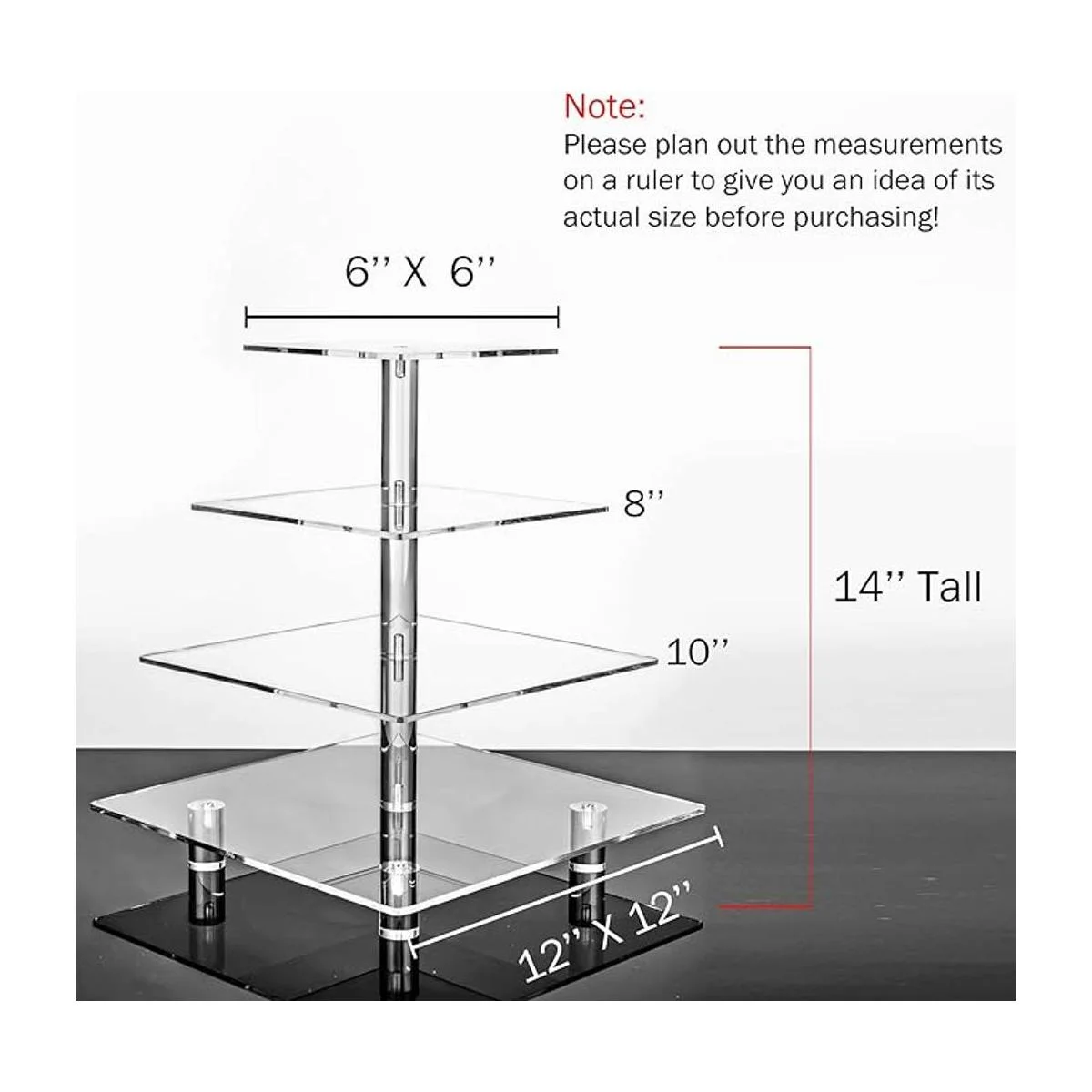 Plate Size: 6 8 10 12, 4 Inches between each tier, 14 tall over all. Read carefully for the measurement when you selecting a cake stand on .