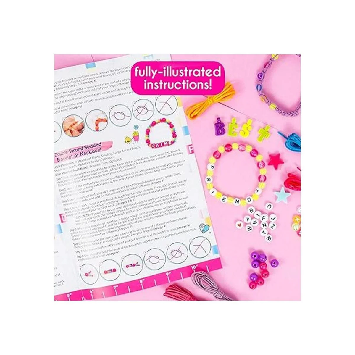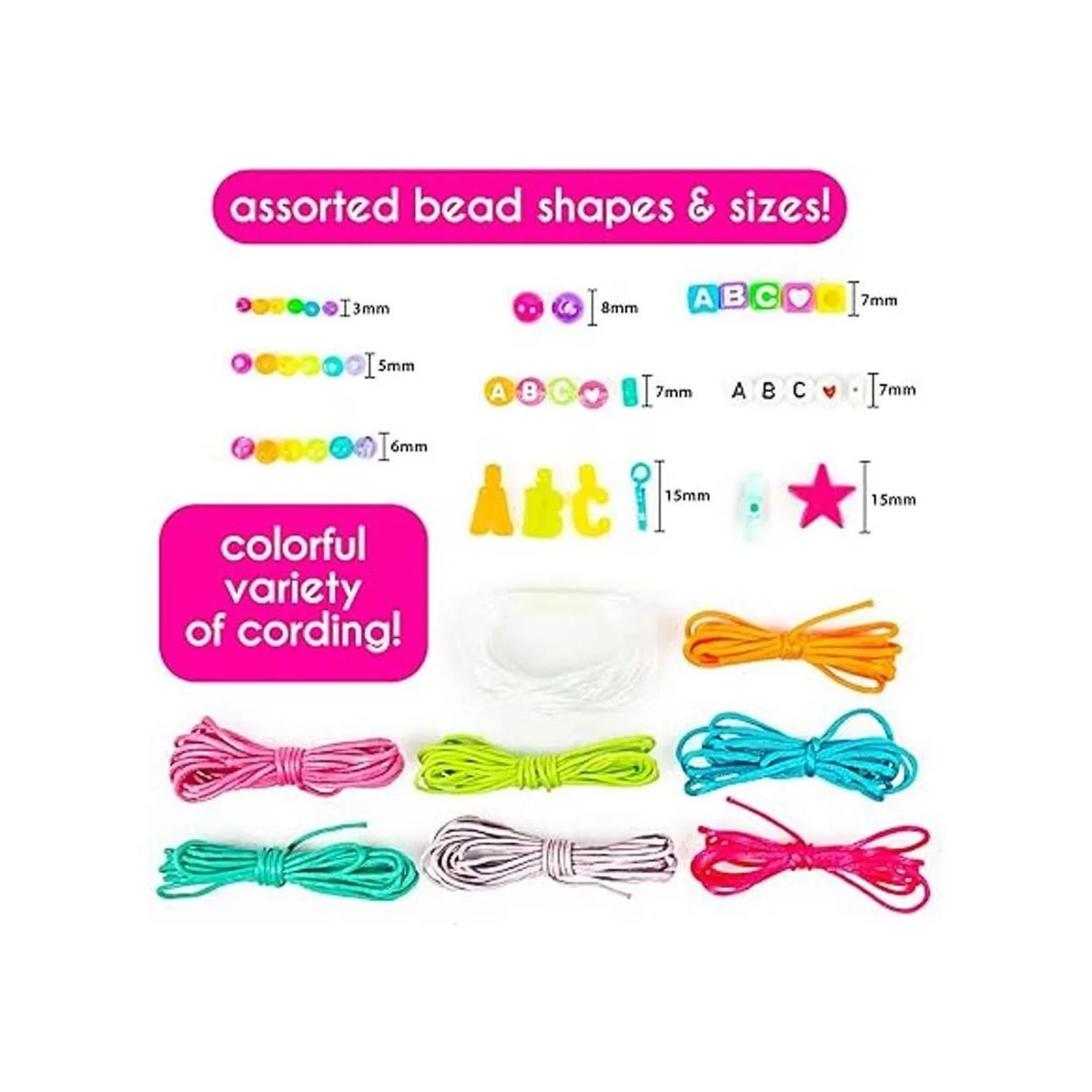 KIT INCLUDES: 1 Skein Elastic Cord 10 yd, 216 Alphabet Beads, 1 Bag Assorted Neon Beads .5oz, 1 Carabiner Clip, 4 Wax Cords 2 yd/ea, 200 Plastic E Beads, 300 Round Beads, 84 Alphabet Charms, 1 Key Ring, 10 Star Beads, 3 Satin Cords 1 yd/ea, EasyToFollow Instructions