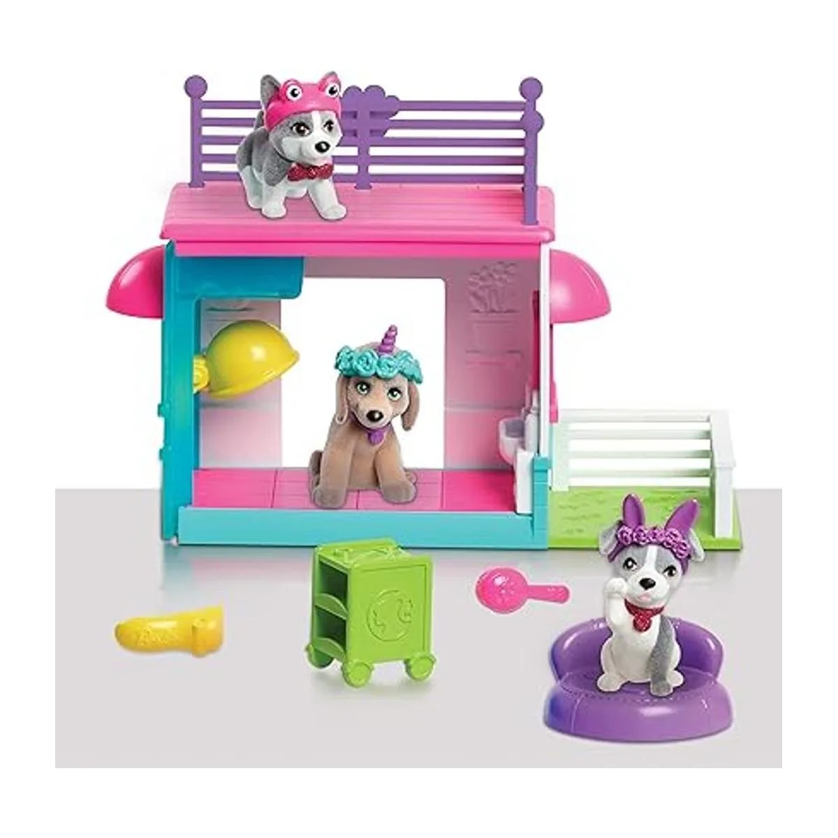El juego de 8 piezas incluye un juego de spa, tres adorables mascotas, un carrito de aseo, un accesorio de recortadora, un accesorio de cepillo y una silla de descanso.