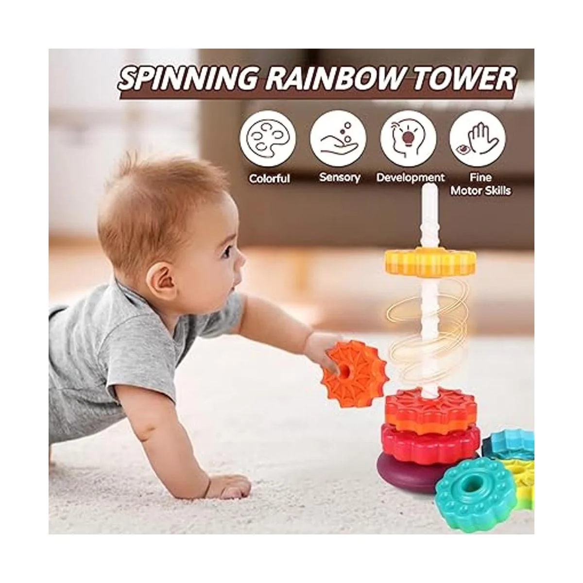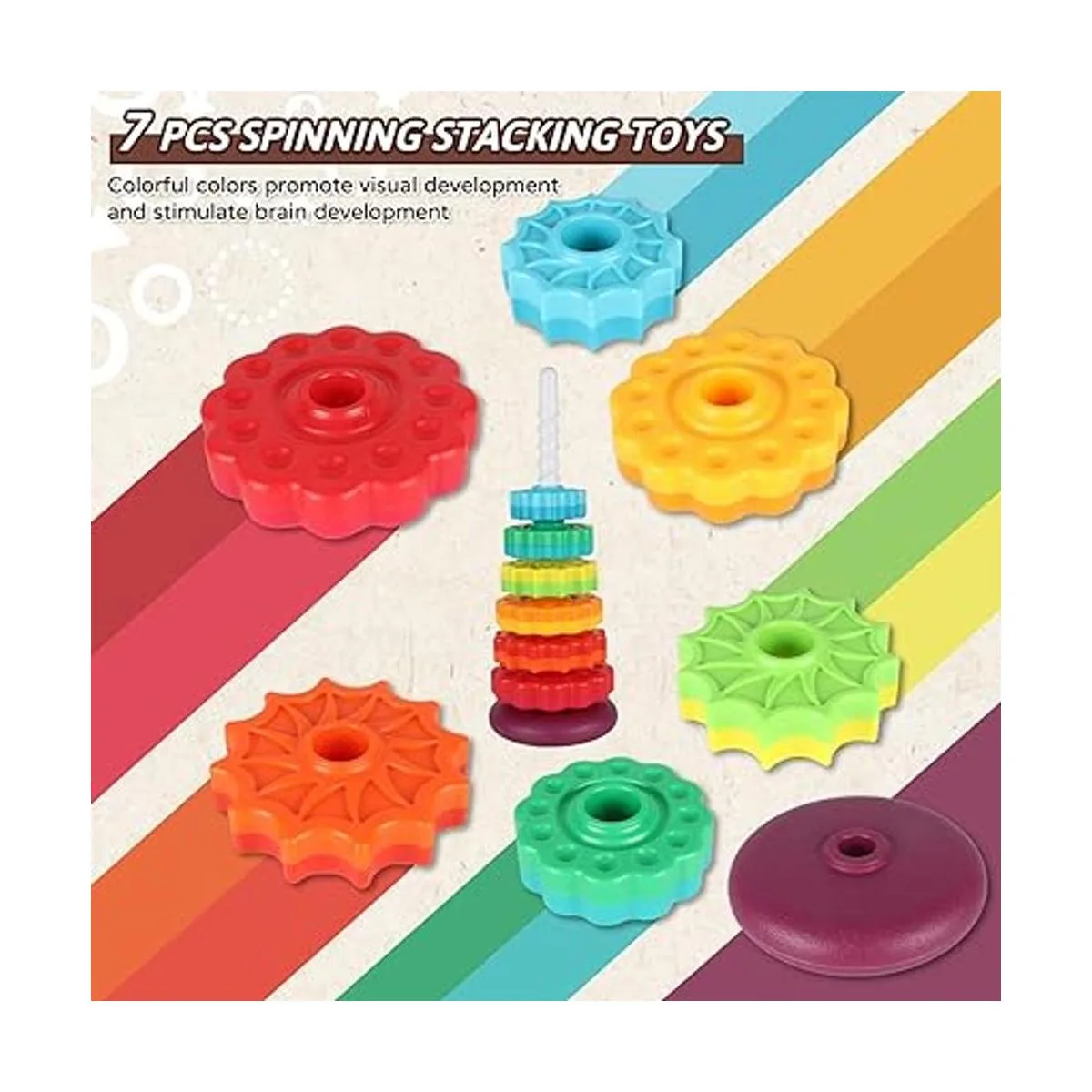 Juguetes apilables y giratorios: el juguete giratorio apilable JUXUE tiene un diseño simple pero creativo, que consta de una varilla de tornillo y rueda de color arcoíris, tu hijo puede usarlo para girar los discos al suelo. Cada disco tiene 2 colores, se puede girar arbitrariamente, ideal para niños a partir de 1 año.