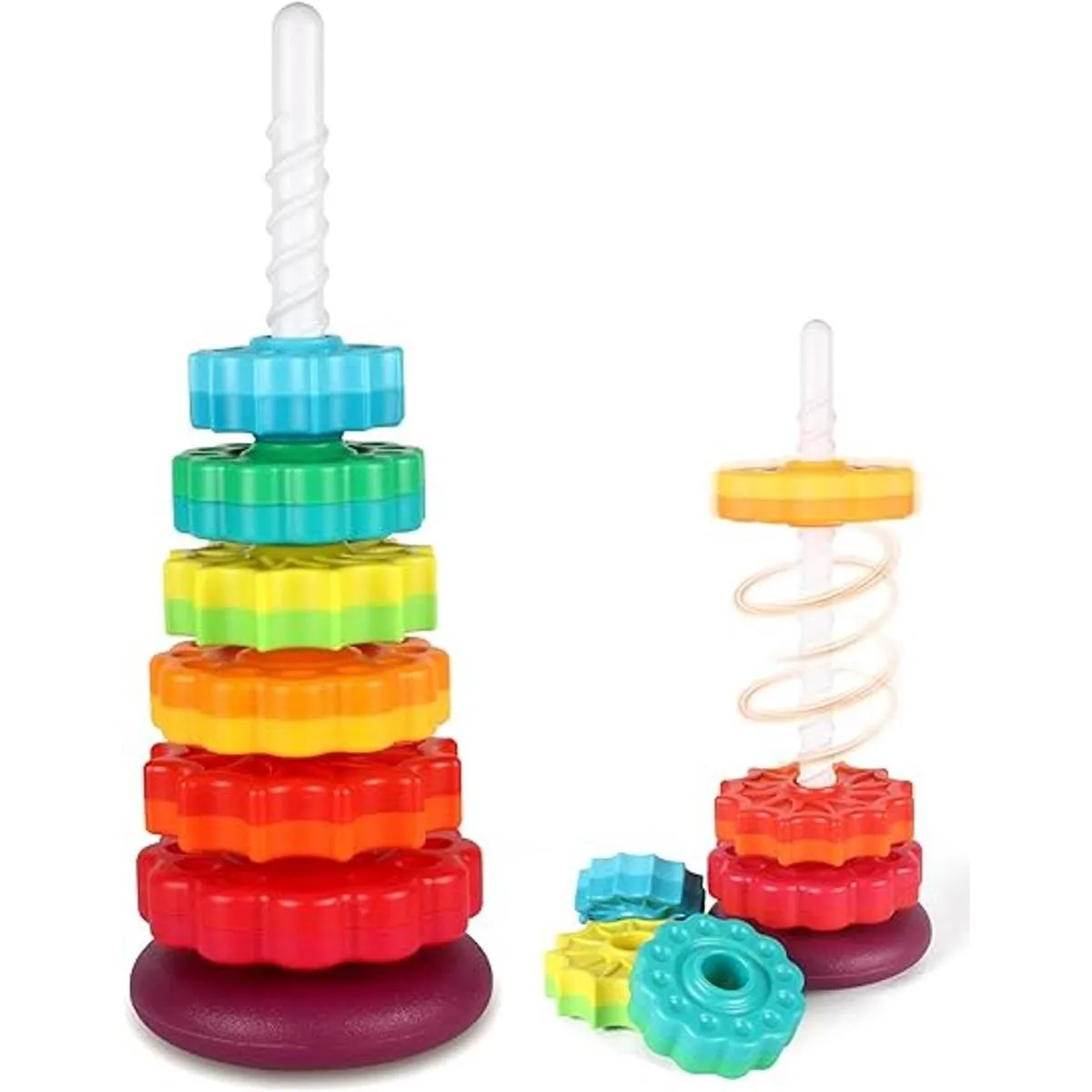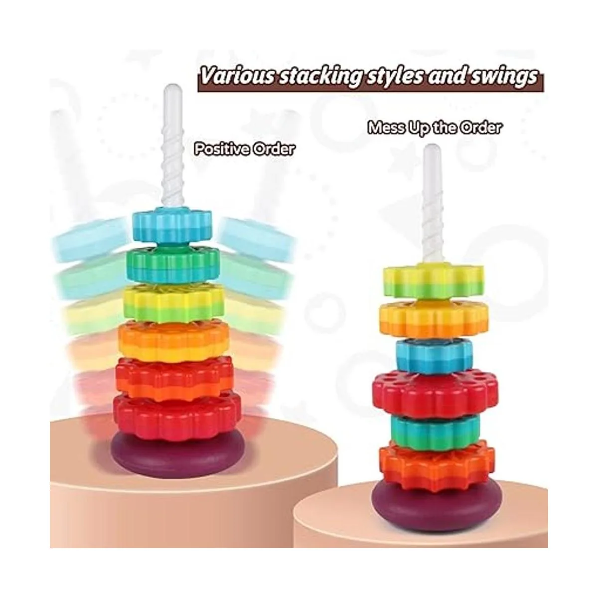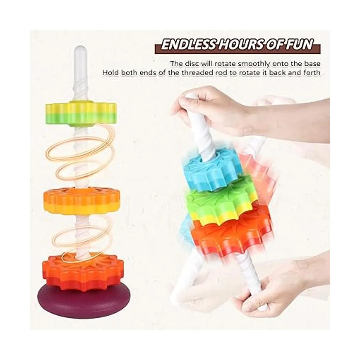 Hora feliz infinita: los niños pueden apilar los discos por tamaño, color, forma o aleatorio; cuando el apilamiento esté completo, tira del poste de la base y ver todos los discos giran lentamente y caen al suelo; gira para ajustar la base para elegir agitar o fijar; alternativamente, puedes sostener el poste en ambos extremos y dejar que el disco gire hacia arriba y hacia abajo sin fin.