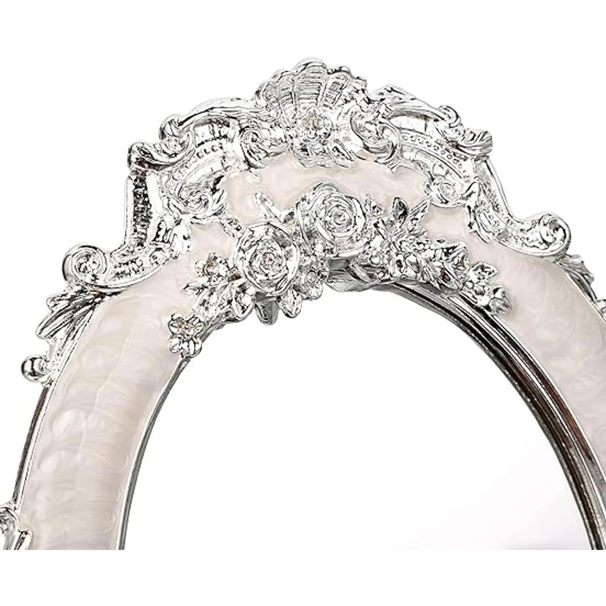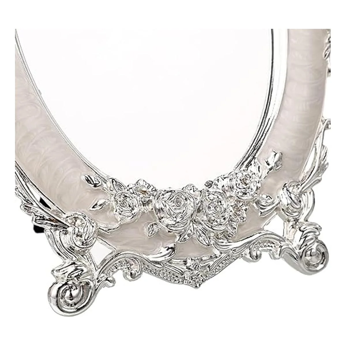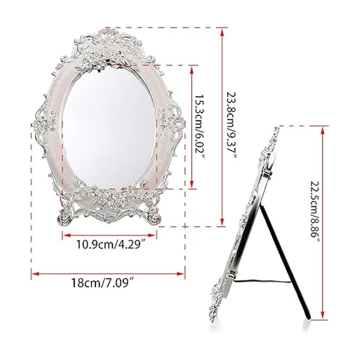 El marco del espejo de escritorio está hecho de aleación de zinc, buena resistencia a la corrosión y no se decolora.