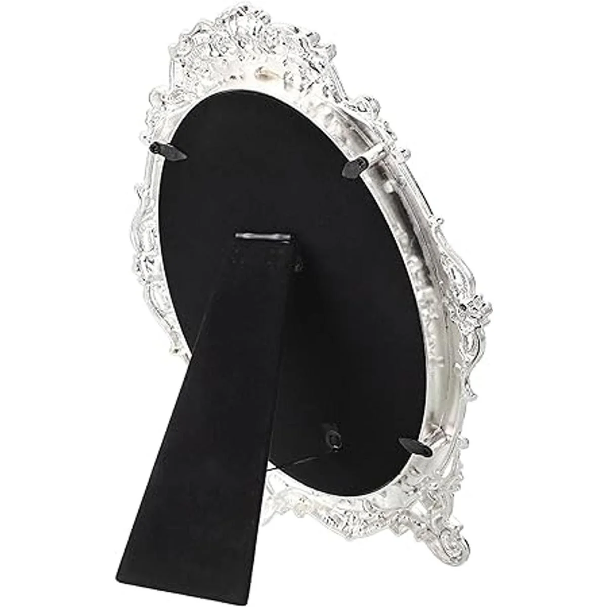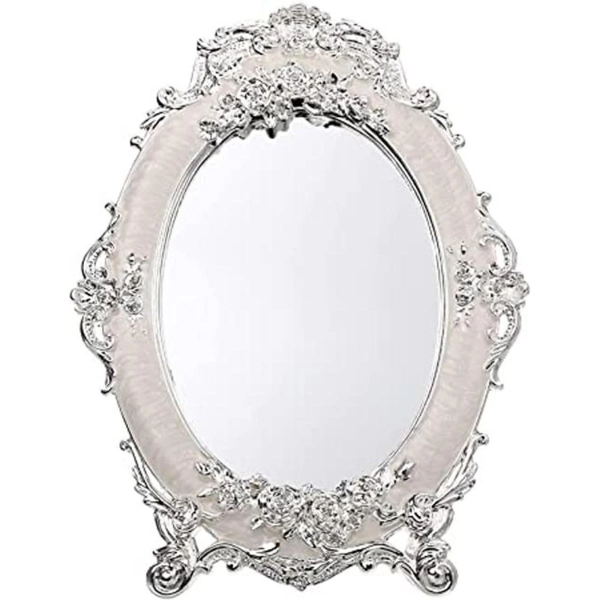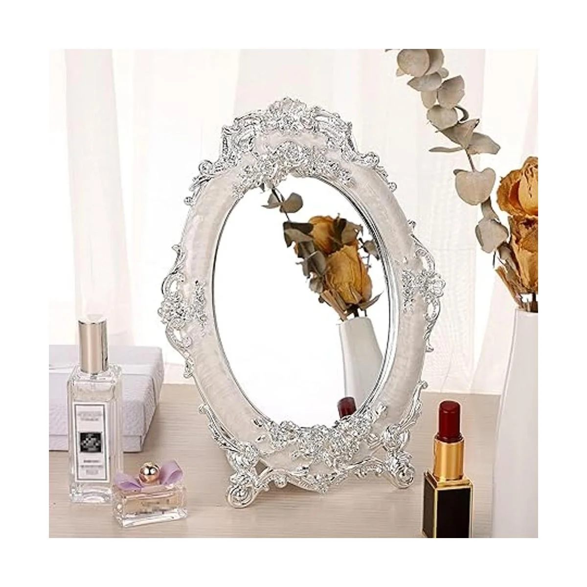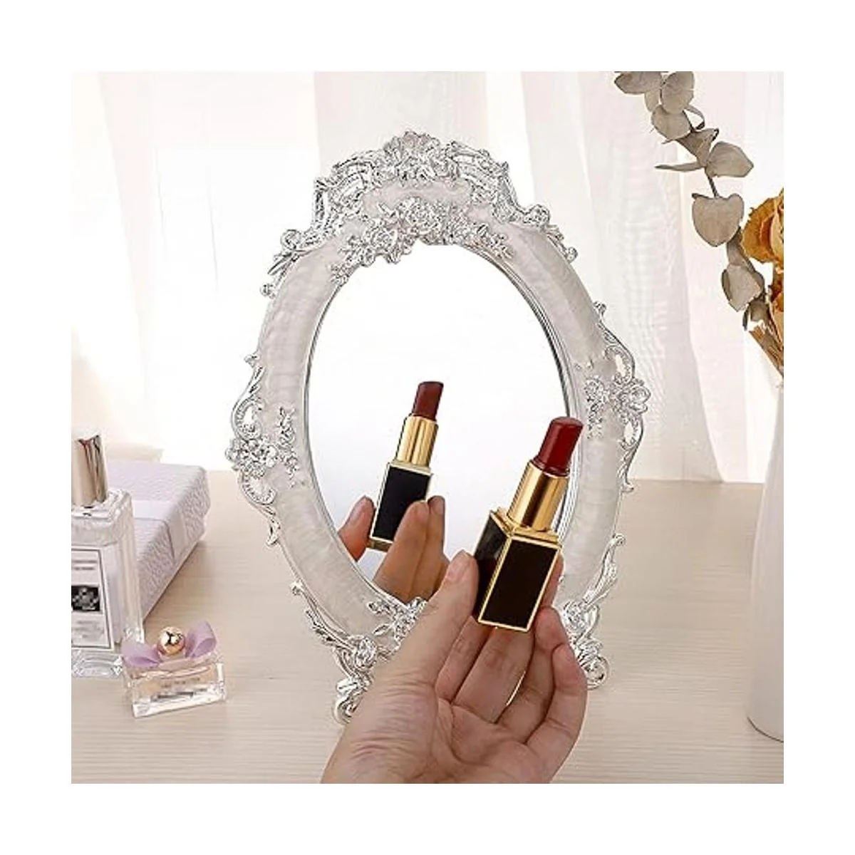 El marco del espejo de escritorio está hecho de aleación de zinc, buena resistencia a la corrosión y no se decolora.