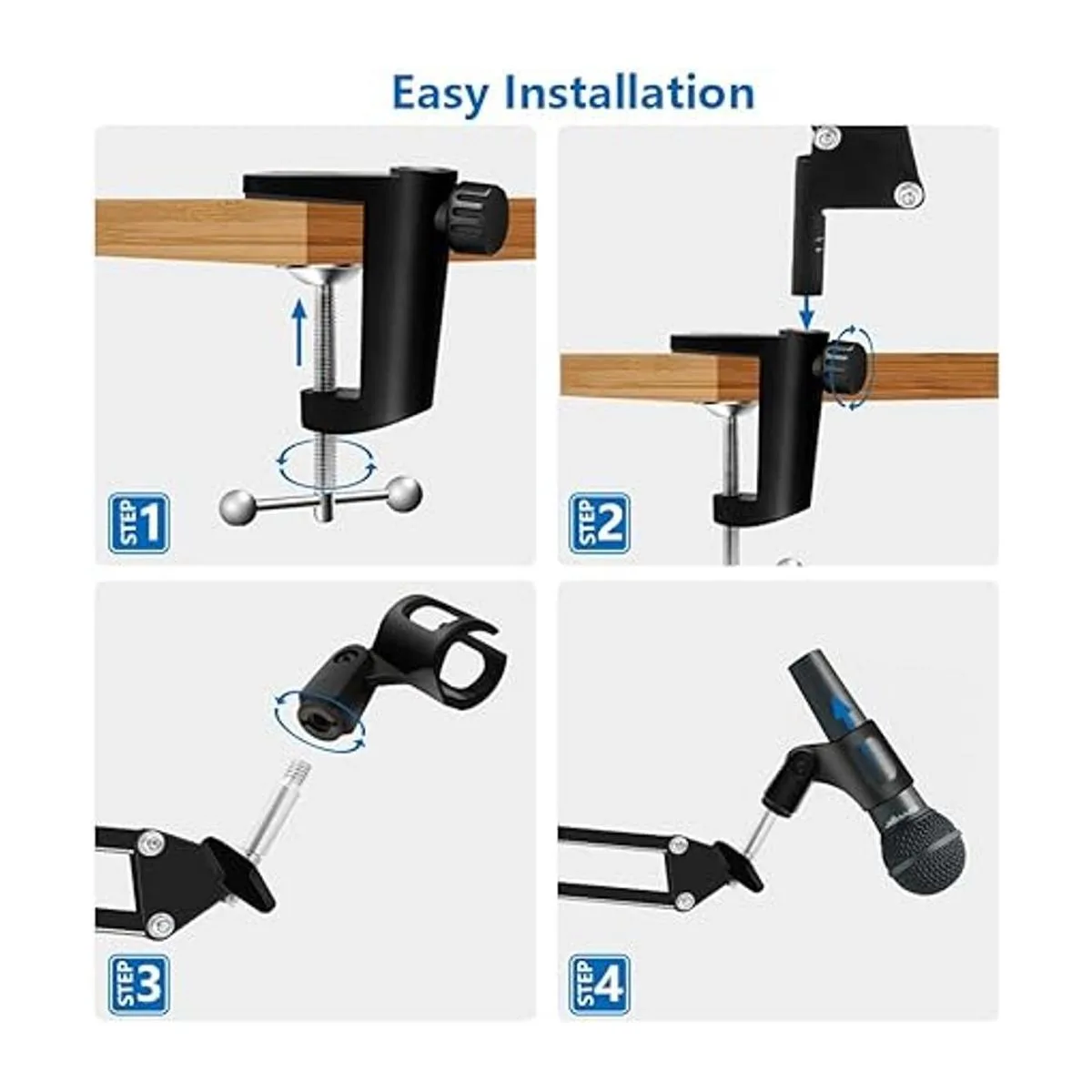Piensa por ti: tiene una abrazadera de montaje de mesa y capas protectoras de esponja, el soporte nunca dañará tus muebles de nuevo. Un tornillo de posicionamiento ajustable se puede enganchar fácilmente a cualquier escritorio con un grosor de 2 pulgadas y permite que tu soporte de micrófono gire 360. Viene con 3 tiras adhesivas, por lo que puedes organizar los cables de tu micrófono.