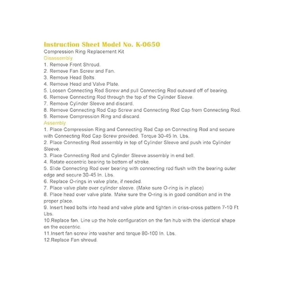 K0650 Kit de anillo de compresión para Craftsman, Black y DeVilbiss, Porter Cable Compresor