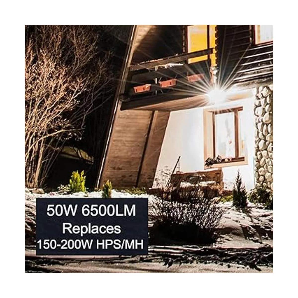 Excelente durabilidad: esta luz LED de 50 vatios para exteriores proporciona una luz blanca brillante 5000 K de 6500 lúmenes, reemplazando la bombilla incandescente de 400 W, pero consumiendo un 85 menos de energía.