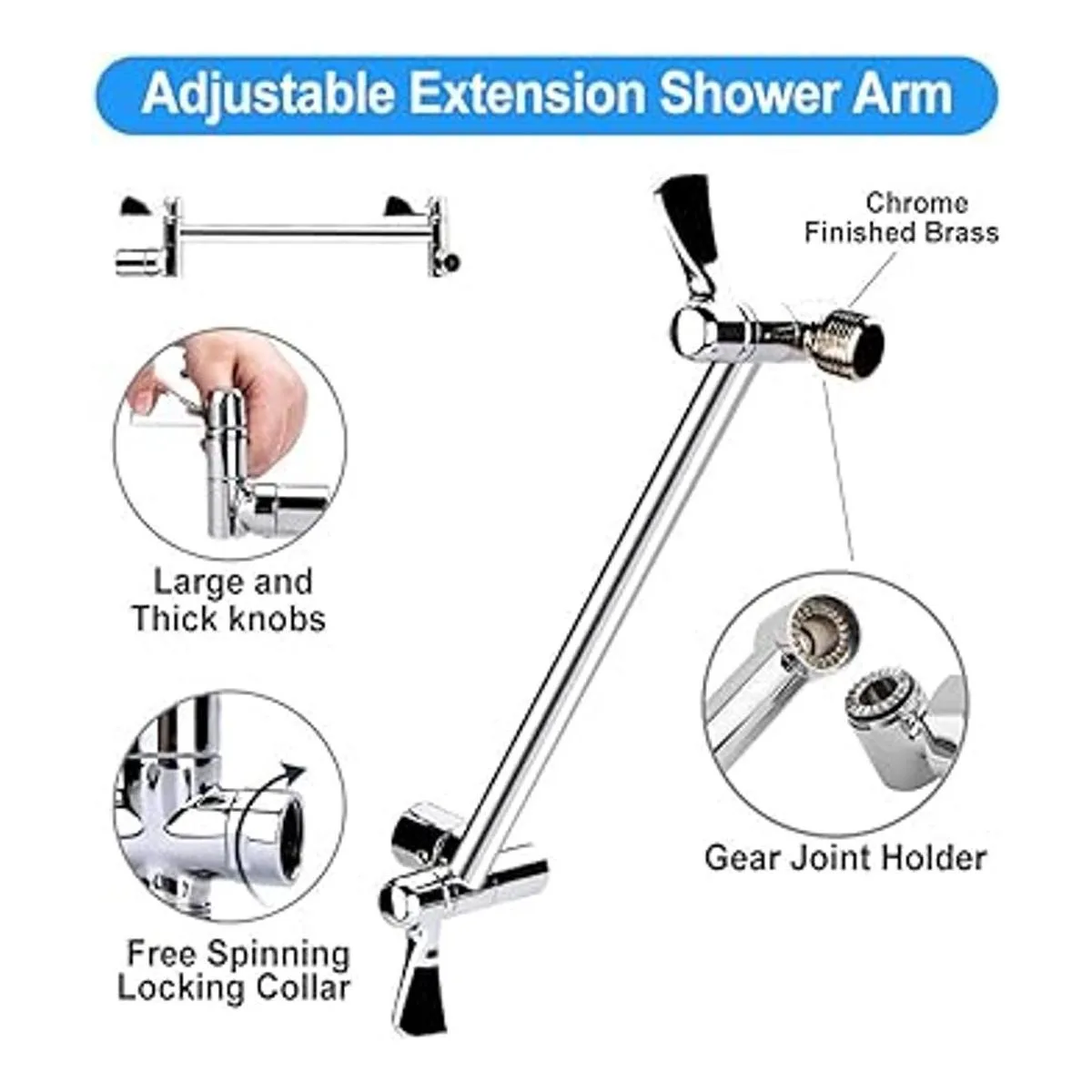 Kaqinu Cabezal de ducha de alta presión de 10 pulgadas, cabezal de ducha de mano con brazo de extensión de 11 pulgadas, cabezal de ducha antifugas con soportemanguera, regulador de flujo, cromado