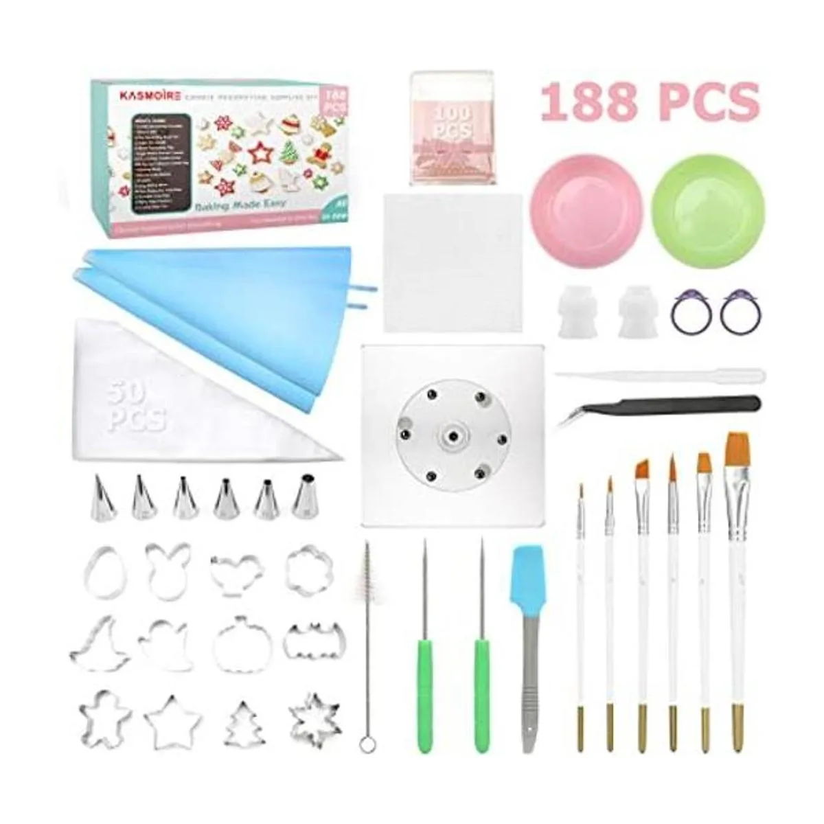 Kasmoire Kit de suministros de decoración de galletas de 188 piezas todo en uno, con 12 cortadores de galletas navideñas, herramientas de mezcla, herramientas de tubería, herramientas de decoración y 100 bolsas de galletas para principiantes y decoradores