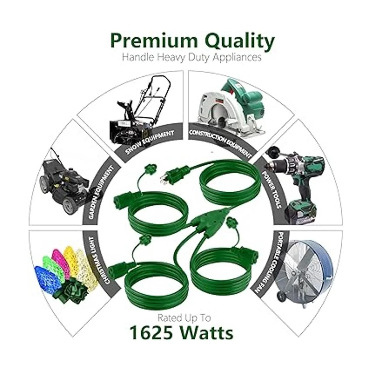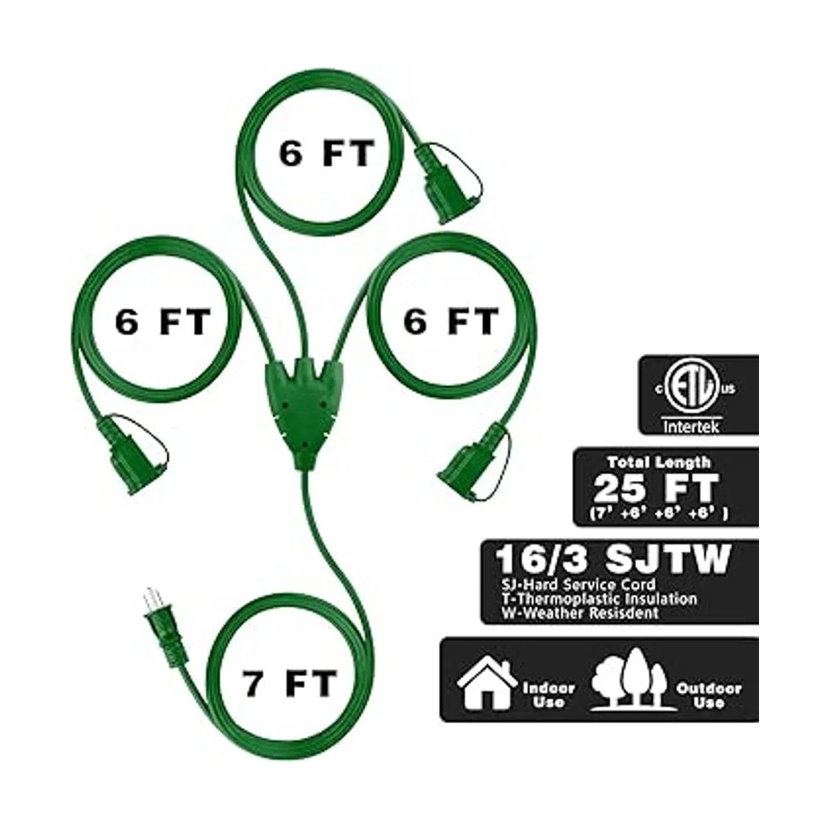 Kasonic Cable de extensión de 1 a 3 divisores, total de 25 pies, longitud máxima de 13 pies de extremo a extremo, 3 enchufes de tomacorrientes, cable SJTW de 16 AWG3C resistente a la intemperie para uso en interiores y exteriores, con certificación ETL